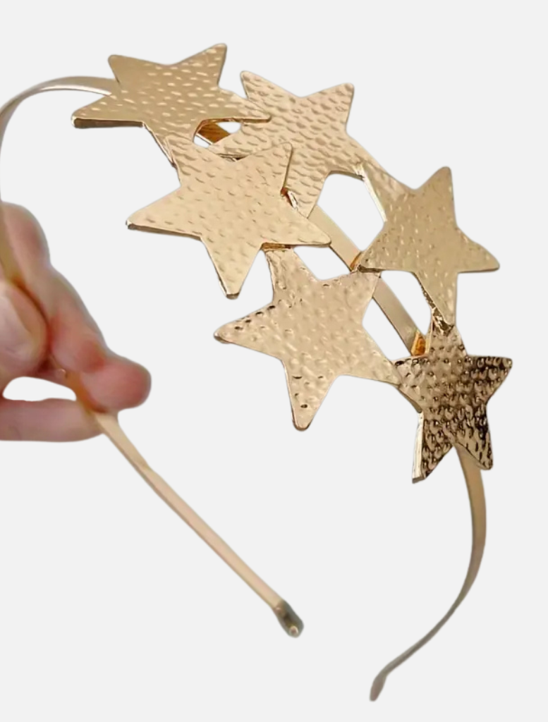 Dress to impress with the Taya Star Headband, an exquisite accessory crafted with matte gold stars on a matte gold band and exquisite craftsmanship. Transform any look with that classic, timeless, and sophisticated touch..