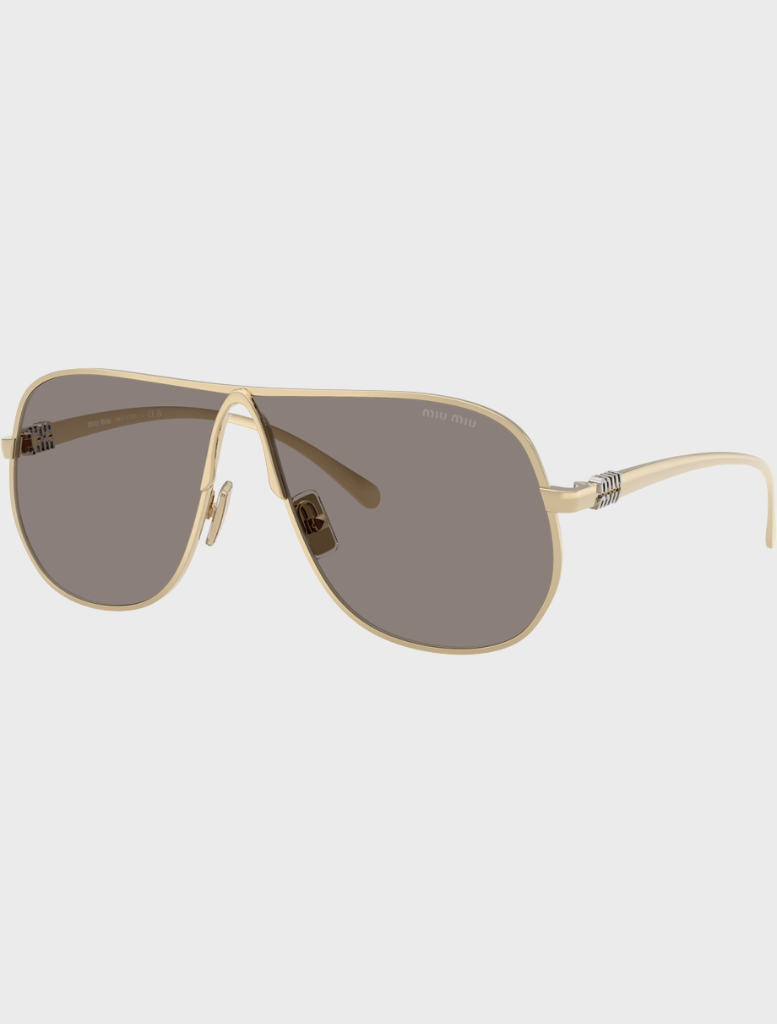 Miu Miu MU A56S ZVN80Q sunglasses for women, featuring pale gold pilot metal frame and dark grey bio polyamide lenses. Adjustable nosepads. Brand line: Main Collection. Style code: 0MU A56S. Color code: ZVN80Q. Made in Italy. Authorized Miu Miu online reseller. Your glasses will include the original case and accessories and are covered by a 12-month global warranty.