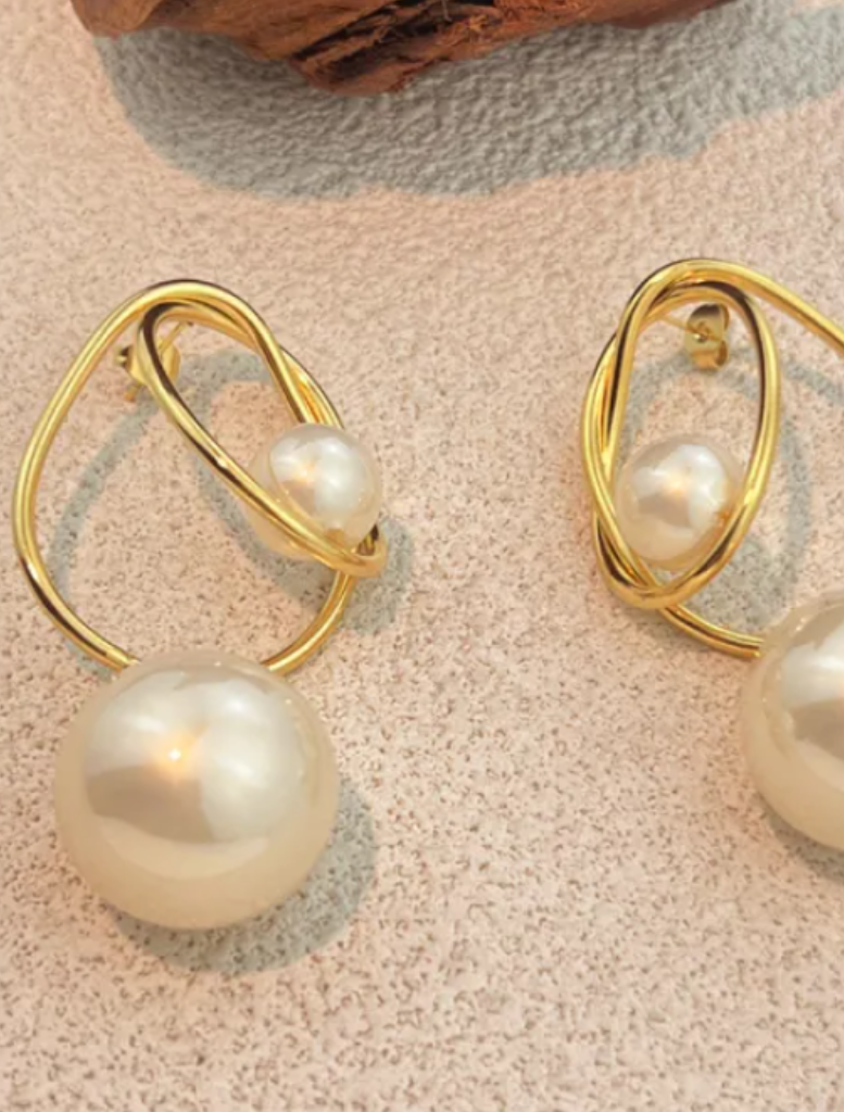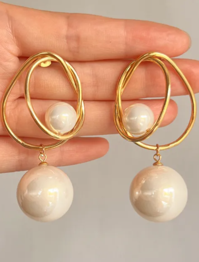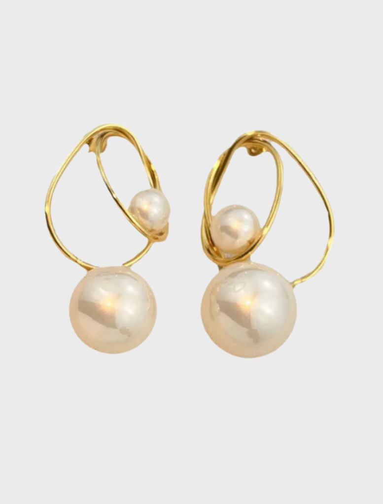 Add timeless elegance to your jewellery collection with these modern gold pearl drop earrings. Designed with an artistic open-loop silhouette, each earring features a duo of luminous ivory pearls - a delicate mini pearl paired with a statement larger pearl for a beautifully balanced look. Lightweight and effortlessly chic, these earrings elevate any outfit from everyday wear to evening glam. A perfect choice for brides, wedding guests, and lovers of classic yet contemporary style.