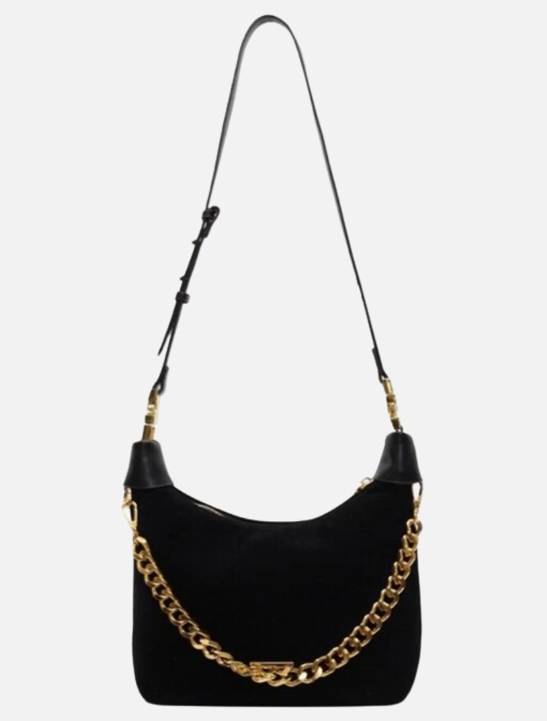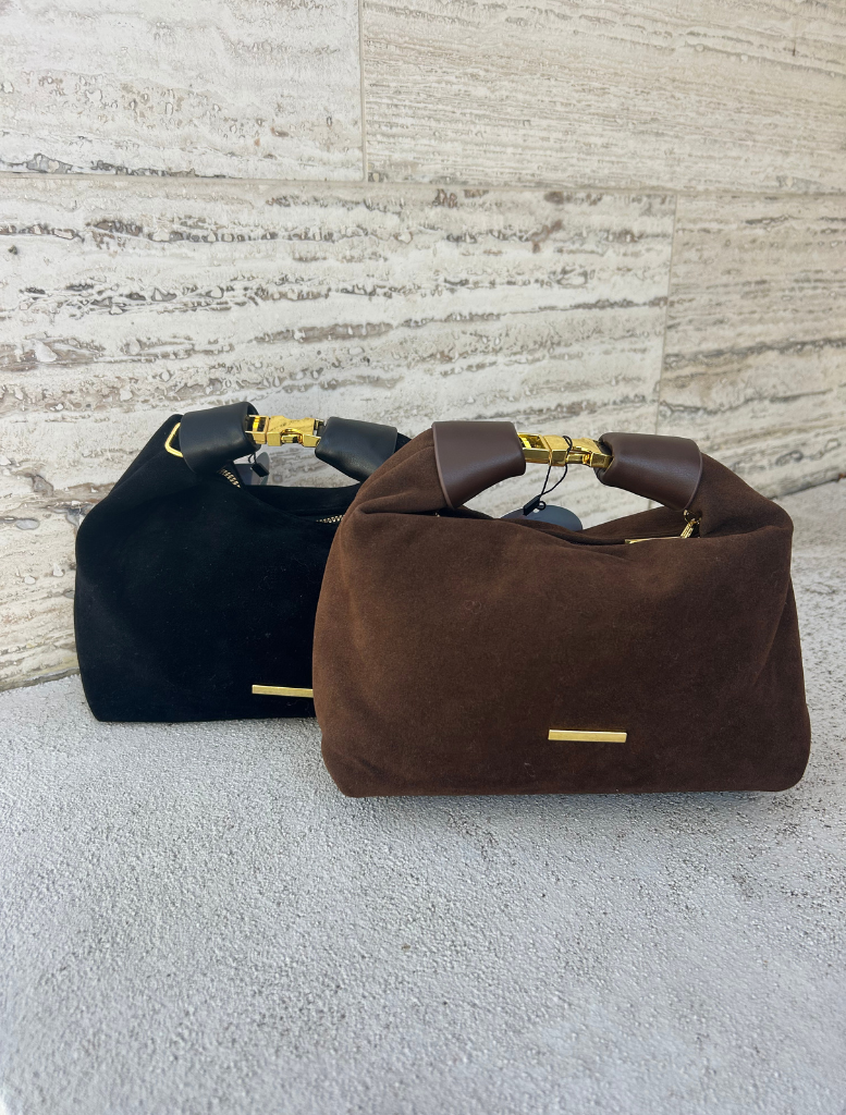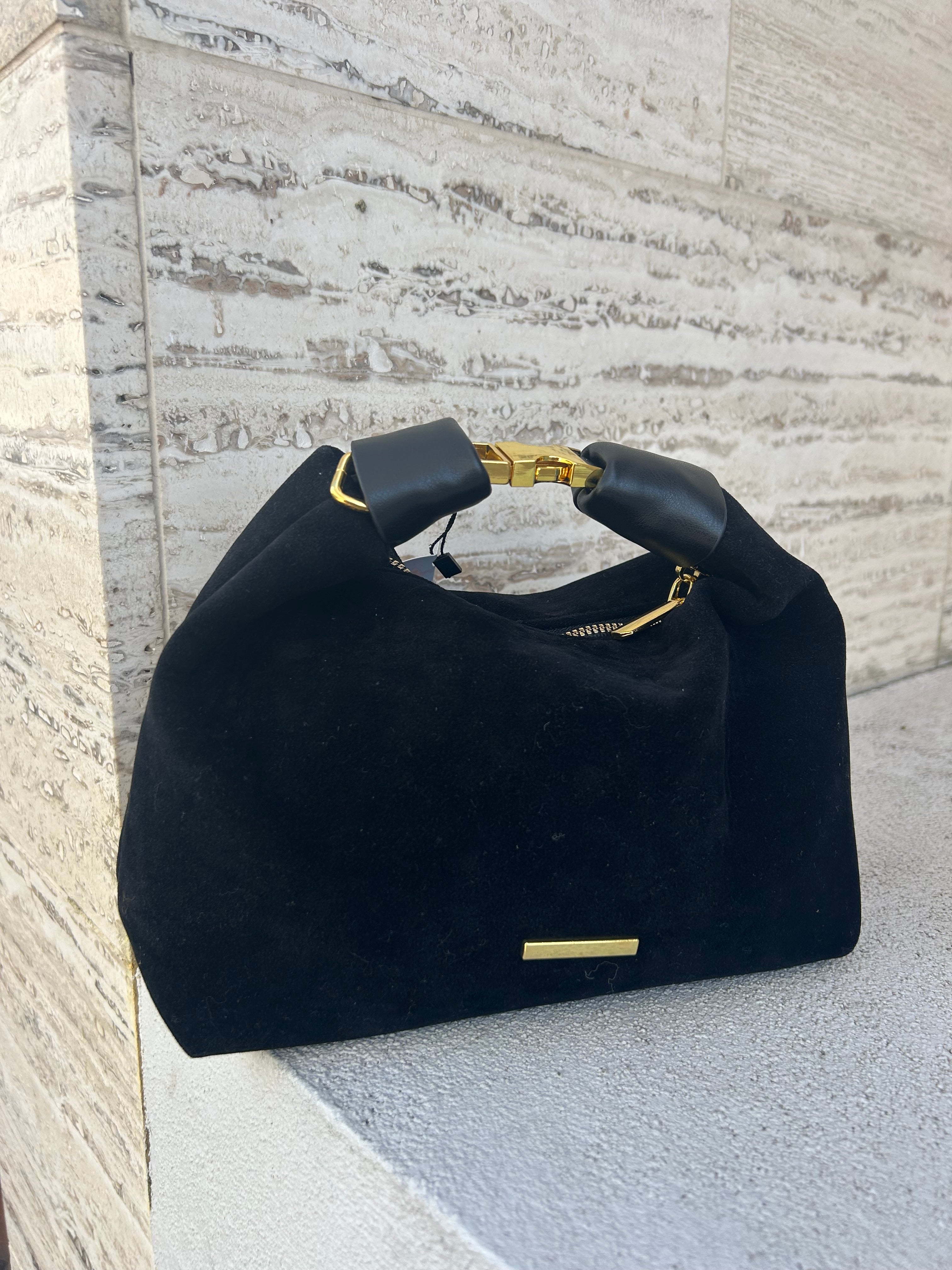 The Briar Bag is a slouchy bag designed in a black suede. With a zip closure, internal zip pocket, and slip pocket, this bag is both practical and stylish. It features a buckle closure as the handle. This bag has been designed with two interchangeable straps, allowing you to wear it as a small carry bag or crossbody style.