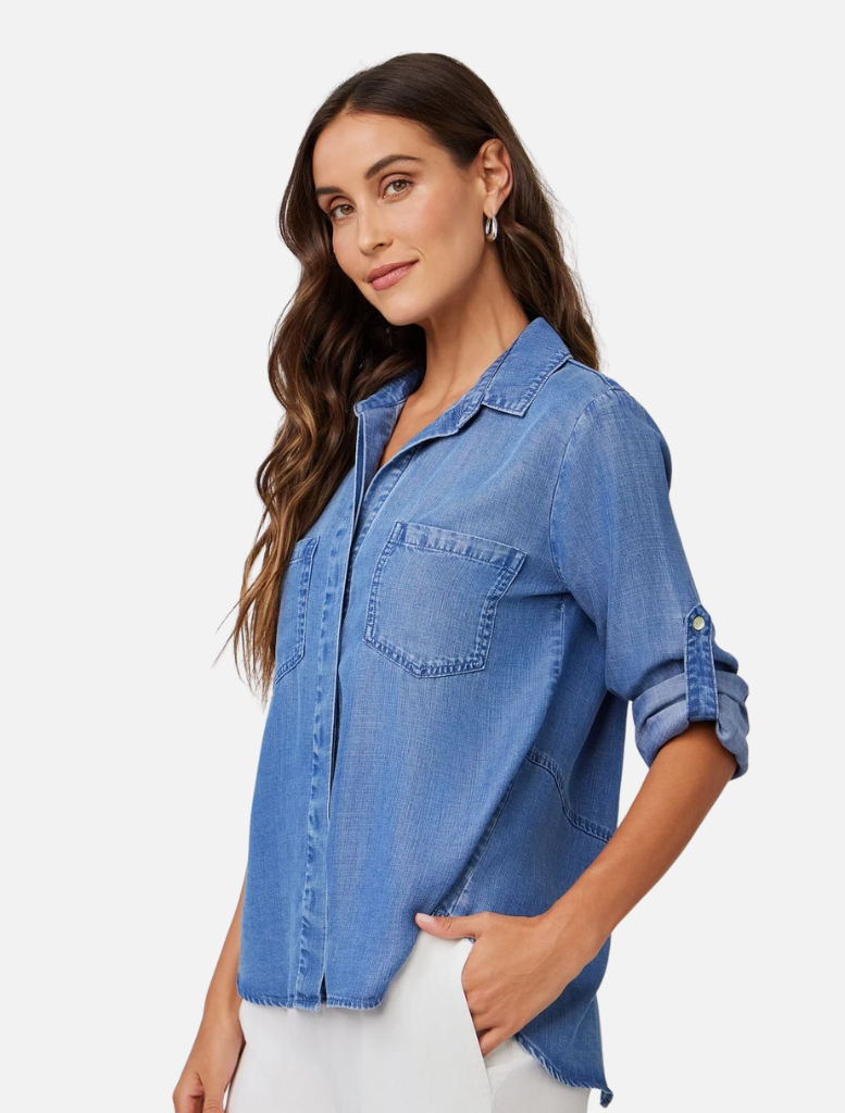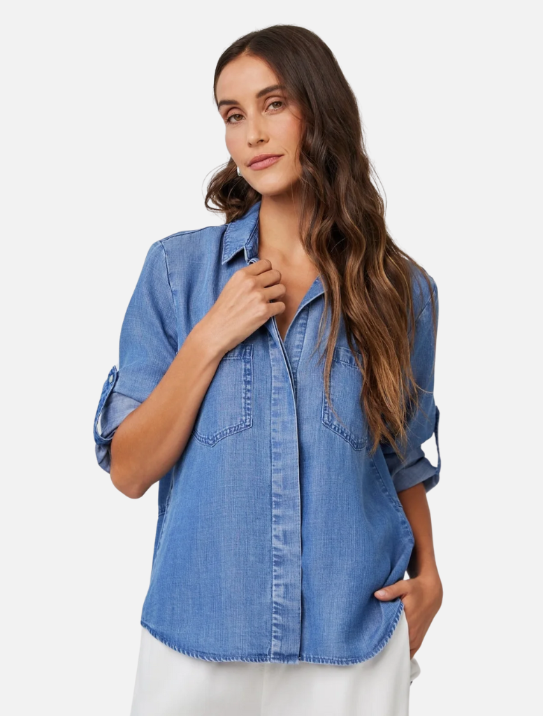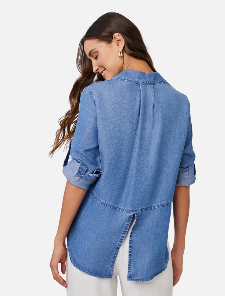 The Split Back Button Down is a signature button down designed with two chest pockets, a split back detail and roll tab sleeves in moonlit haze denim wash that feels as good as it looks.
