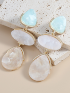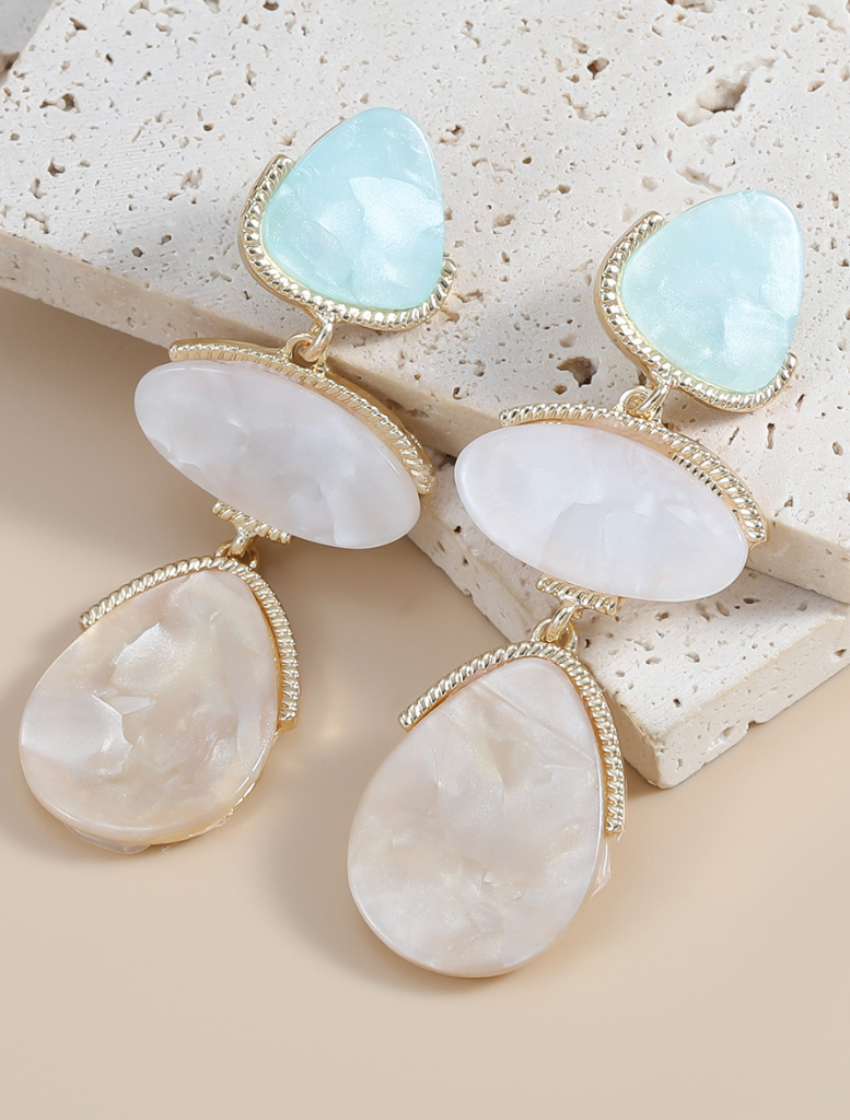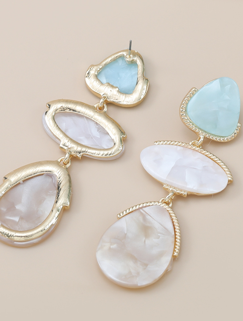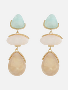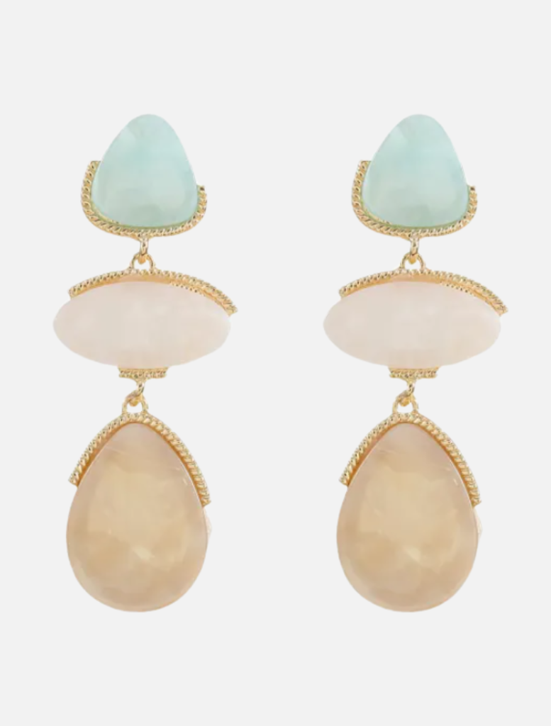 The Poet Earrings feature a 3 tiered drop shaped drop design of aqua, pastel pink and beige that hangs gracefully. This design blends soft hues and timeless charm for a sophisticated look, adding adding subtle elegance and natural beauty to any outfit.
