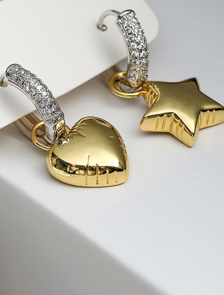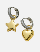Elevate your style with these chic hoop earrings, featuring mismatched puffy star and heart charms in silver and gold tones. Perfect for stacking or wearing solo, they add a playful touch to any ensemble.