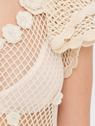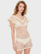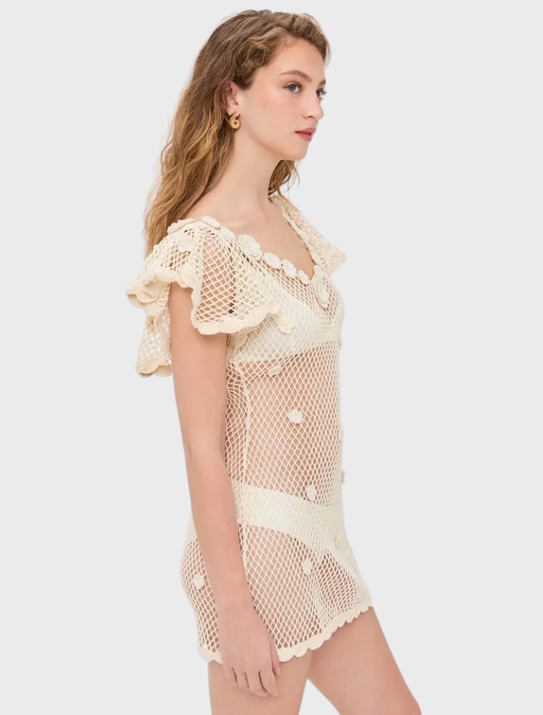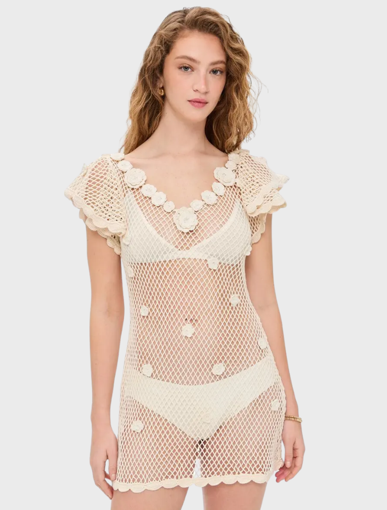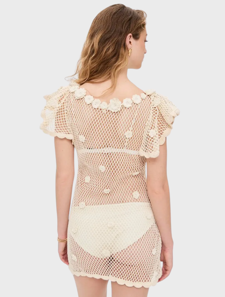 Fabric: Lightweight open knit with stretch. Scalloped edges and floral appliqué. Mini length. V neck. Flutter sleeves. Pullover design, no closure. Shell: 100% cotton. Unlined. Hand wash. Imported, India. Measurements: Measurements from size S Length: 31.5in / 80.0cm, from shoulder.