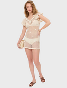 - Details: scalloped edges, floral appliqué, V-neck, flutter sleeves