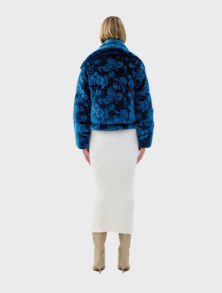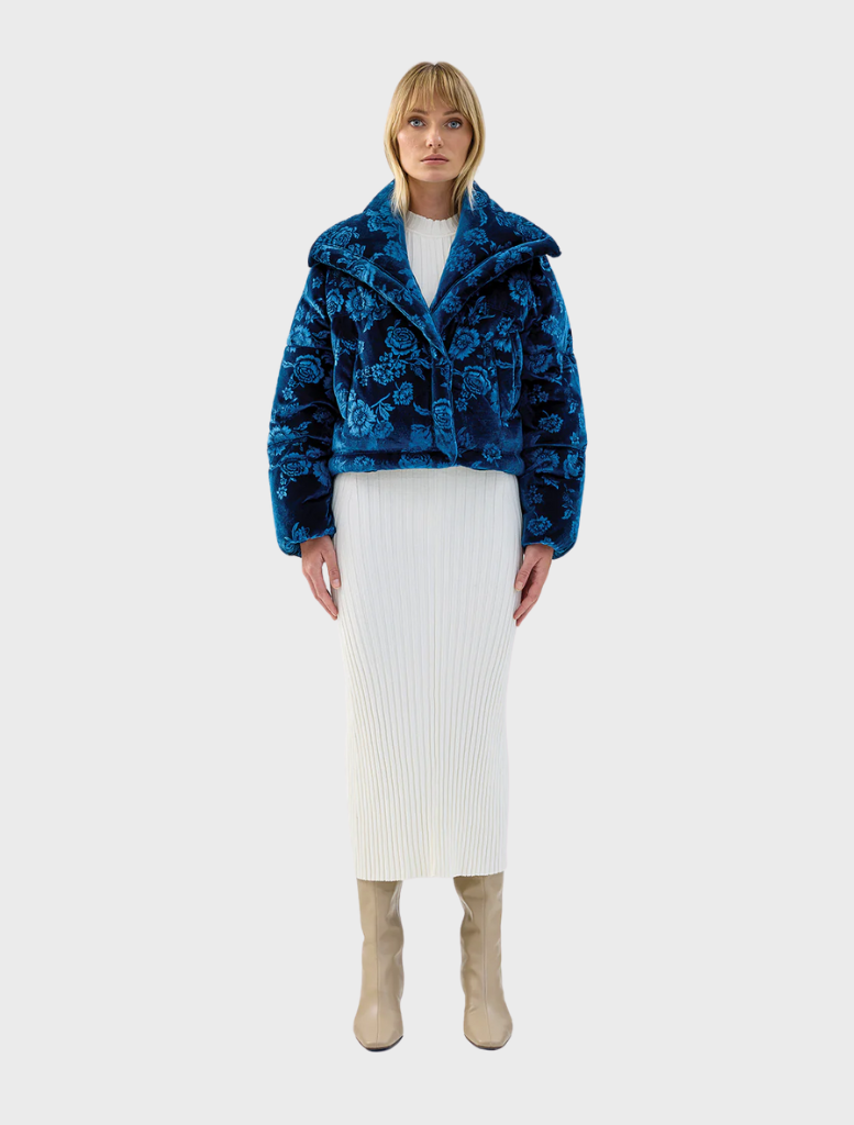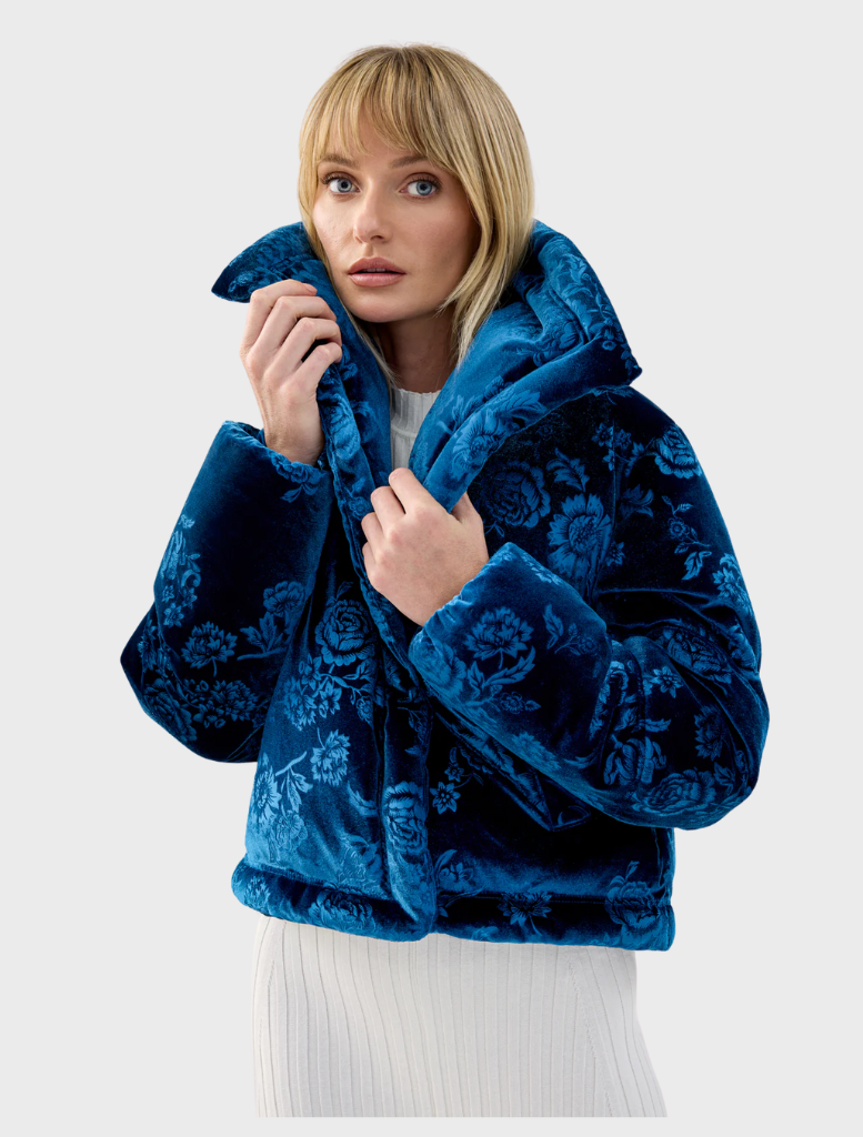 A velvet puffer jacket with a dramatic wrap collar, floral embossing, and overlapping button closures. This style reaches the hips and features satin lining and twin front pockets.