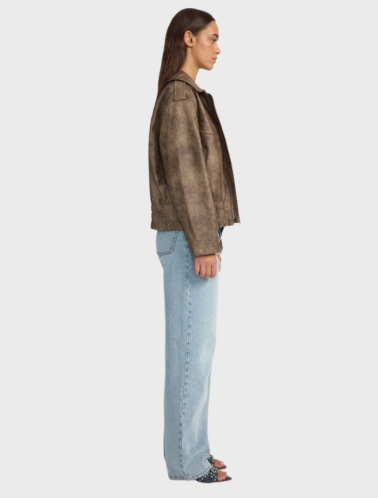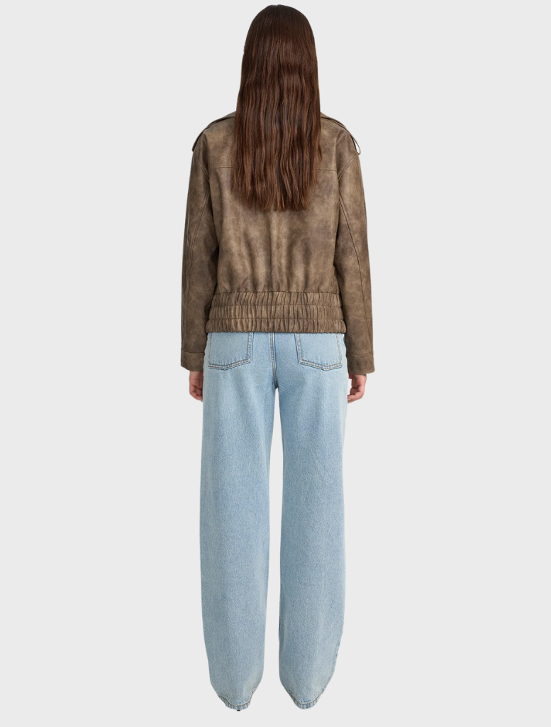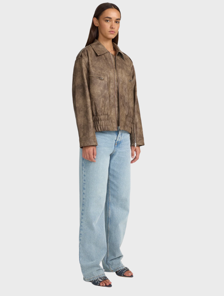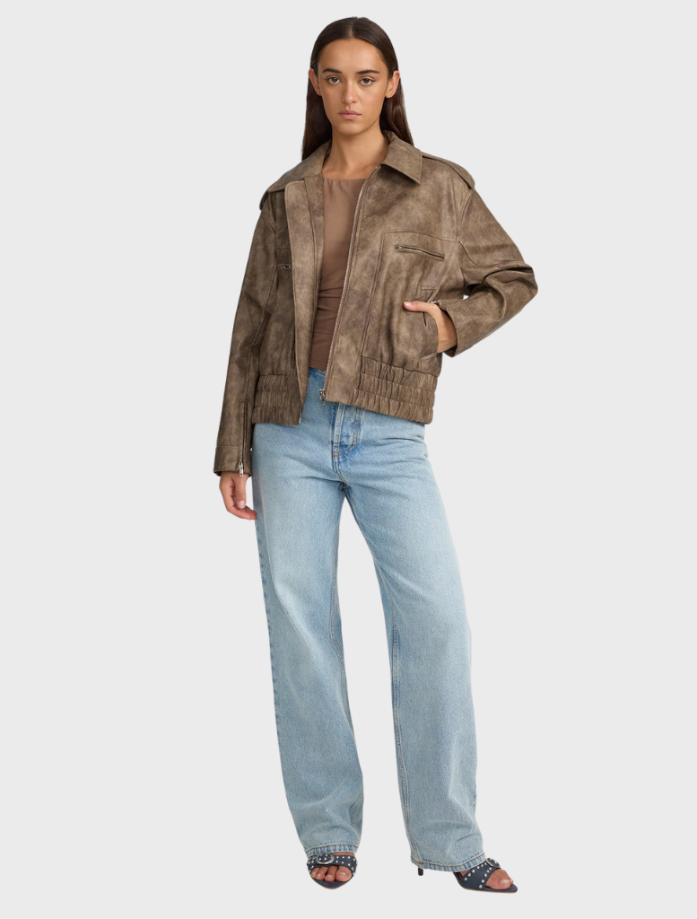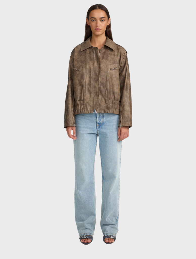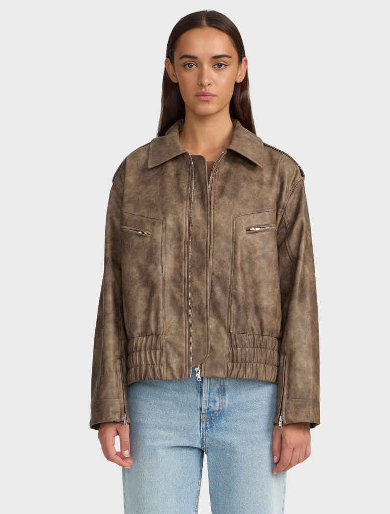 The Vyper Bomber Jacket by Ownley is an oversized jacket made from a distressed PU fabrication. The jacket has a classic collar and features heavy metal zippers on the body and sleeves. The jacket is fully lined and features an elastic hem band for a tailored fit.