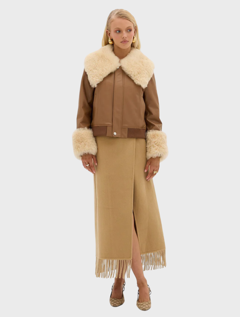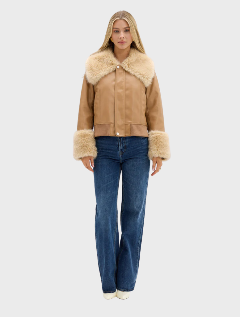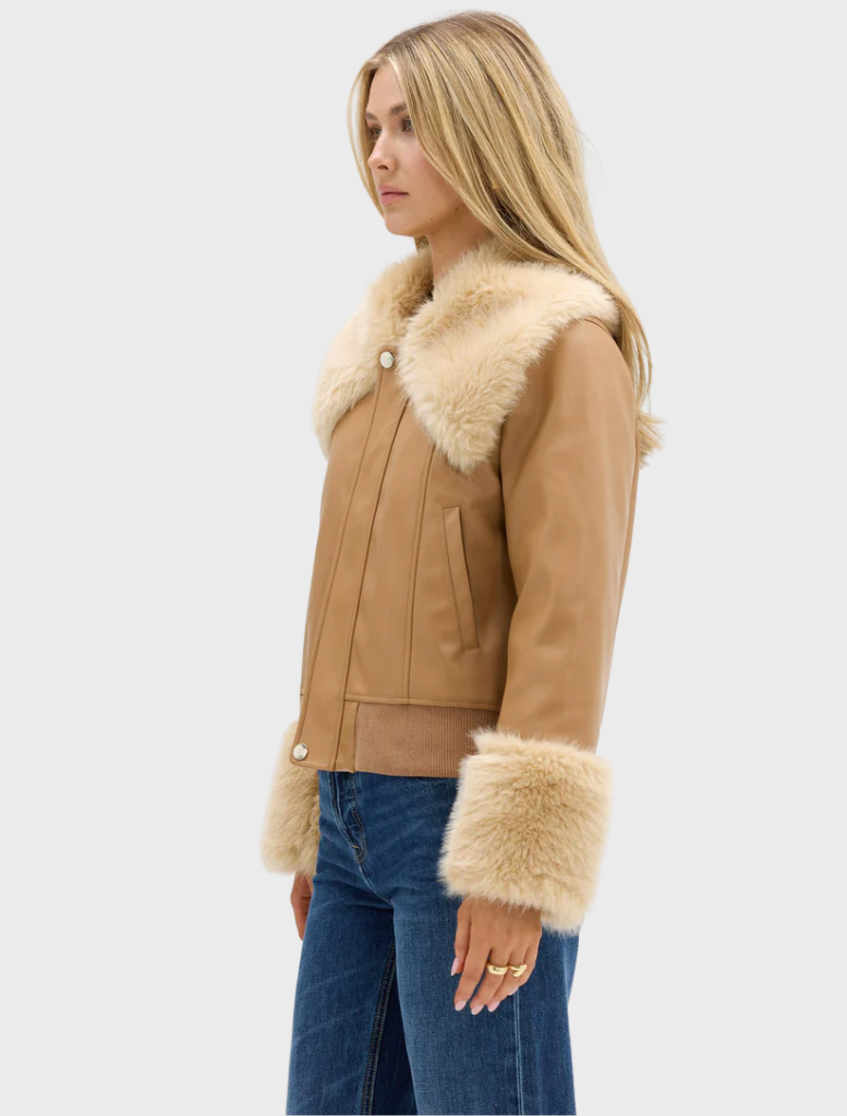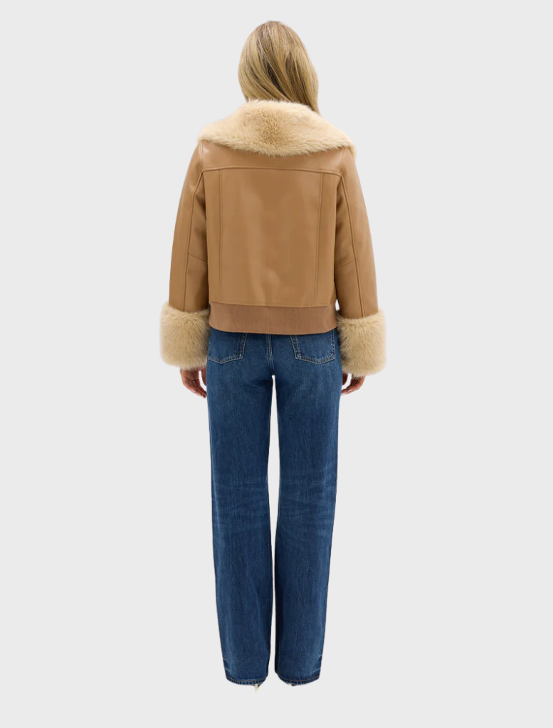 Elevate your outerwear collection with the Willow Jacket, a timeless staple you’ll reach for season after season. Designed in a rich walnut hue, this down jacket features a soft, leather-look finish with plush shearling accents and a premium down filling for warmth all season long. Featuring an oversized collar, statement cuffs, and relaxed fit, the Willow Jacket is made for layering—whether you’re throwing it over denim for a casual day out or pairing it with tailored pieces for a more polished look.