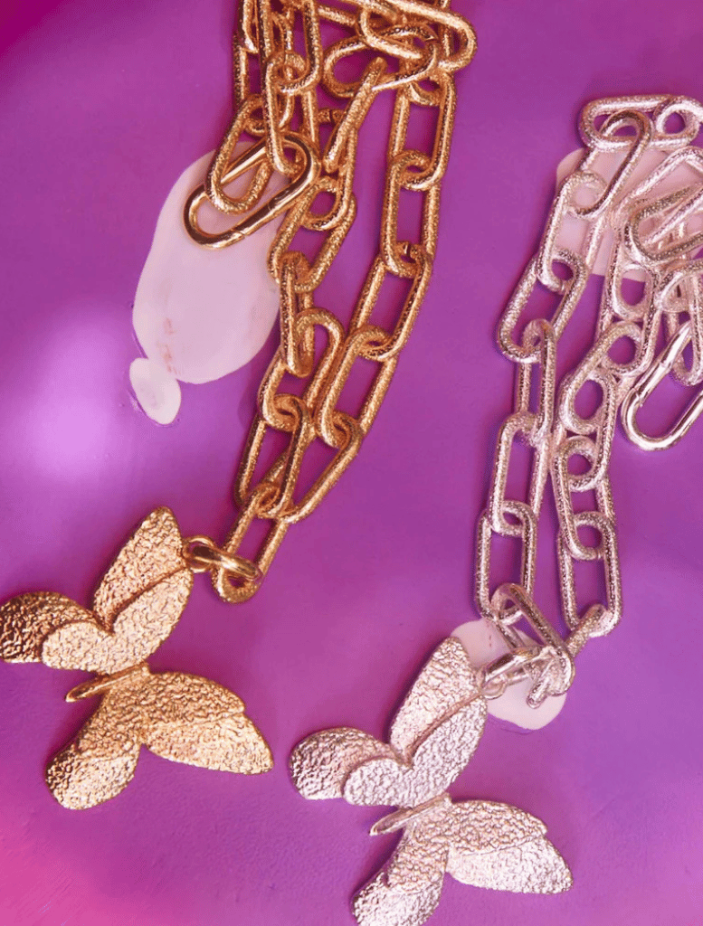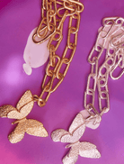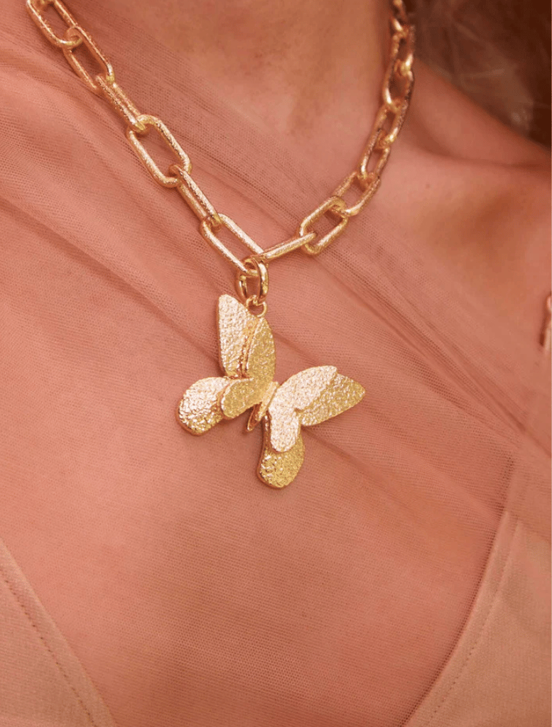 The EMMA PILLS necklace showcases a bold and distinctive finish, crafted from recycled 14k gold plating. Featuring a detachable butterfly charm, this elegant piece measures 44cm in length with a 3cm charm, adding a touch of versatility to your style.