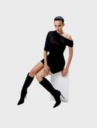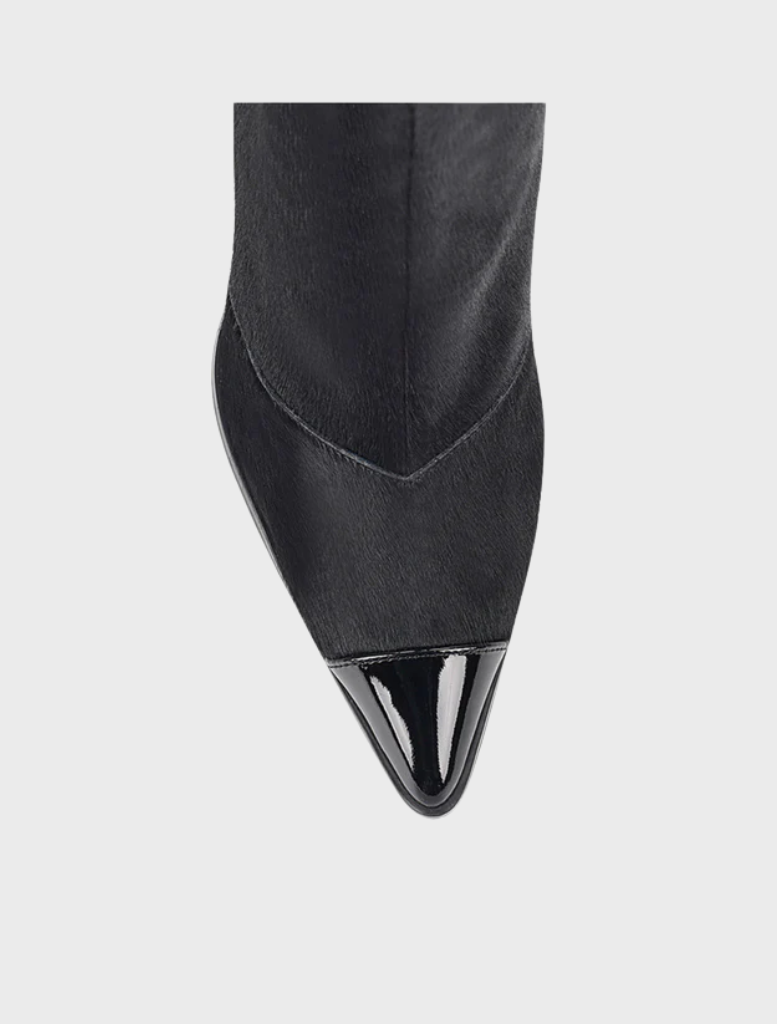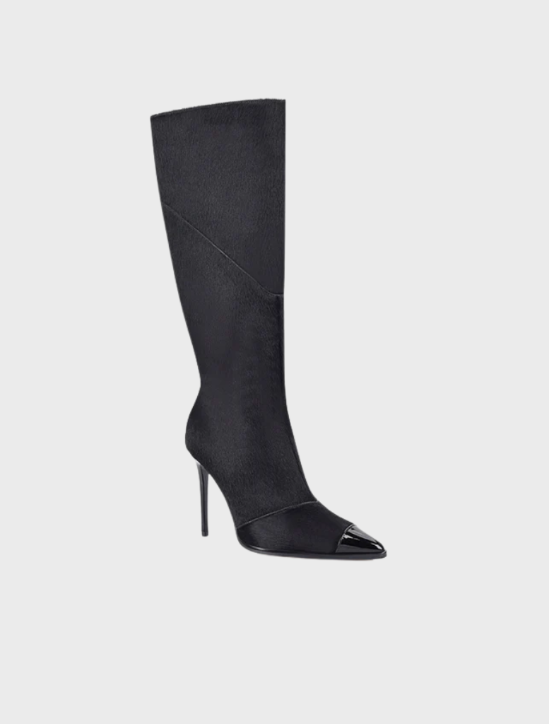 Dylan is the missing piece in your winter wardrobe, crafted from soft black calf hair and complemented by sleek black patent leather accents. Enhance your look with its sleek stiletto heel, pointed toe, and knee-grazing silhouette. This versatile knee-high boot adds texture to your ensemble and pairs effortlessly with micro hemlines or tucked under pants.
