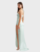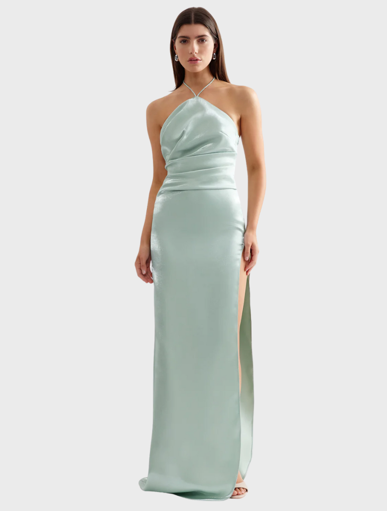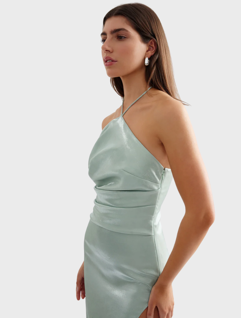 The Vera Dress features a diamond-shaped neckline and a gorgeous straight skirt. Crafted from liquid-look fabric that shimmers with every move, it features tucks at the waist, which flatter the body in all the right places. It features delicate spaghetti halter straps that tie at the back of the neck.