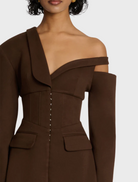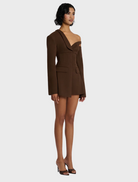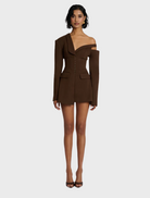 The Ayla Blazer Dress is a striking blend of elegance and modern edge, designed to make a statement at any event. Crafted in a sleek chocolate wool-blend, this dress features a bold off-the-shoulder design, exuding sophisticated charm with a contemporary twist.