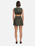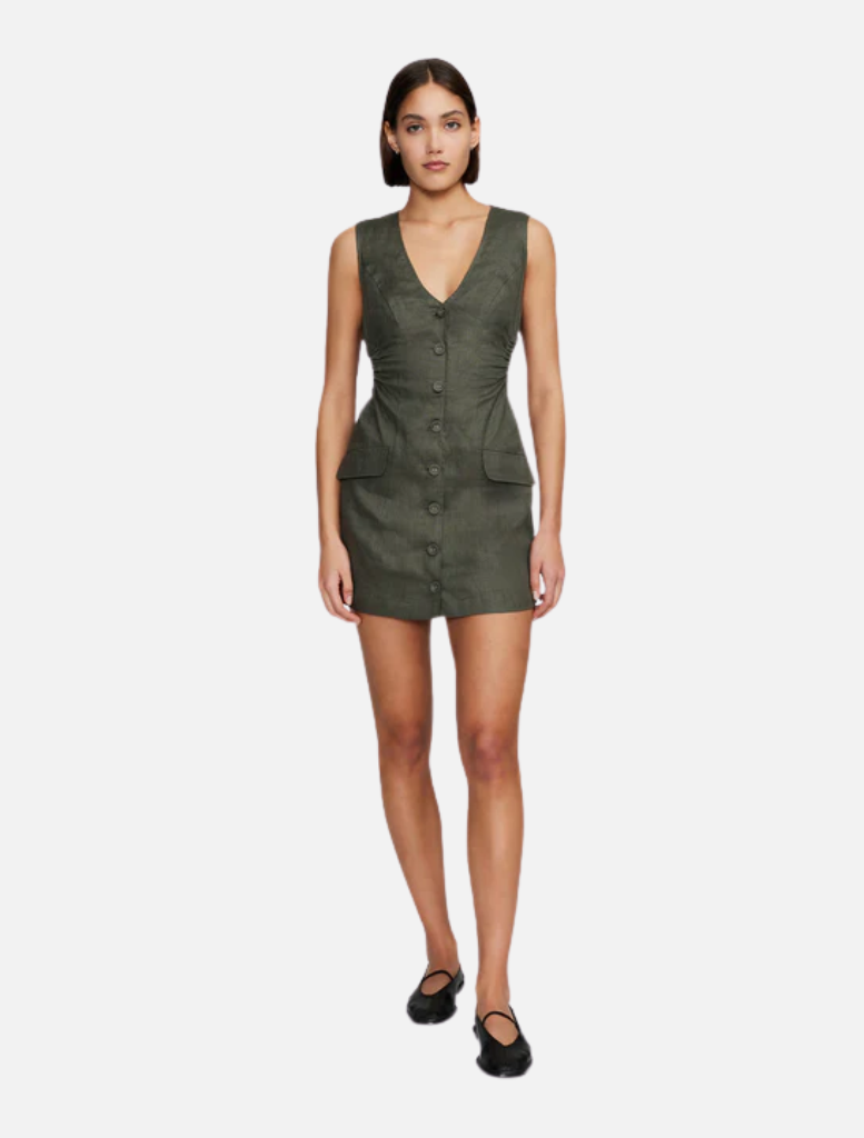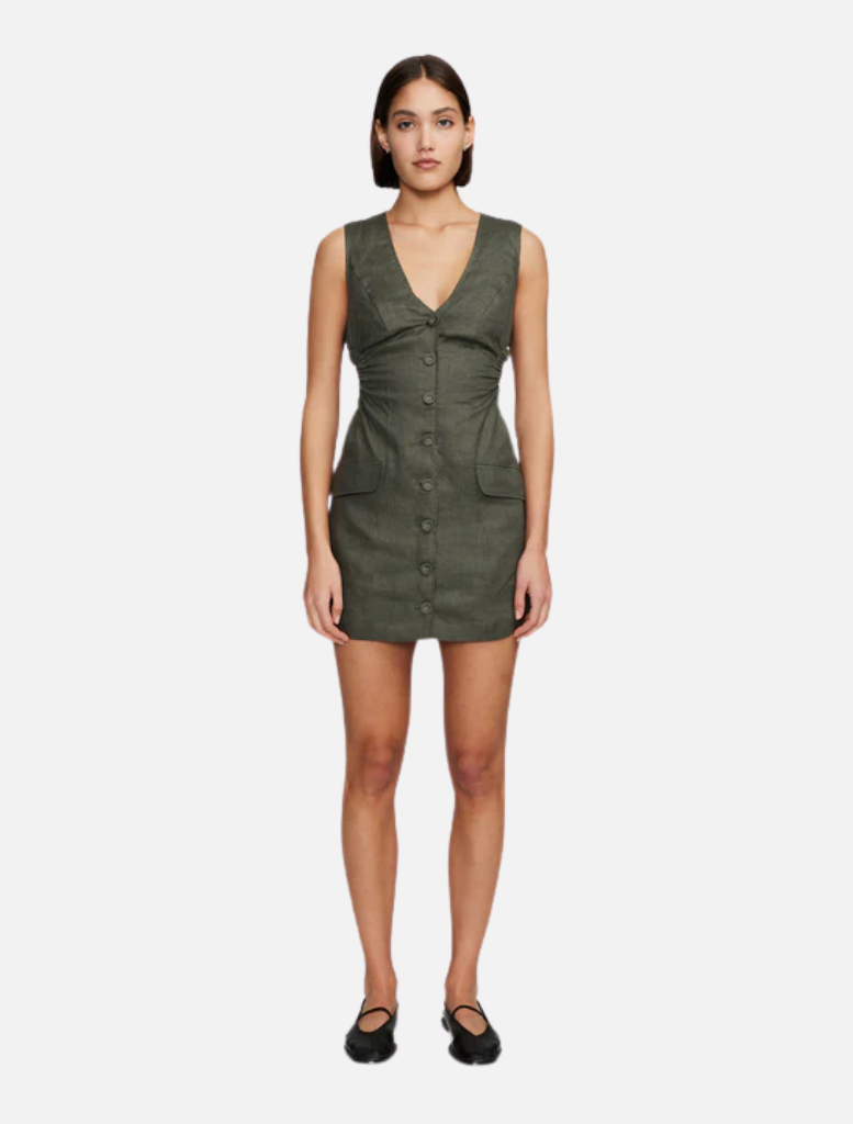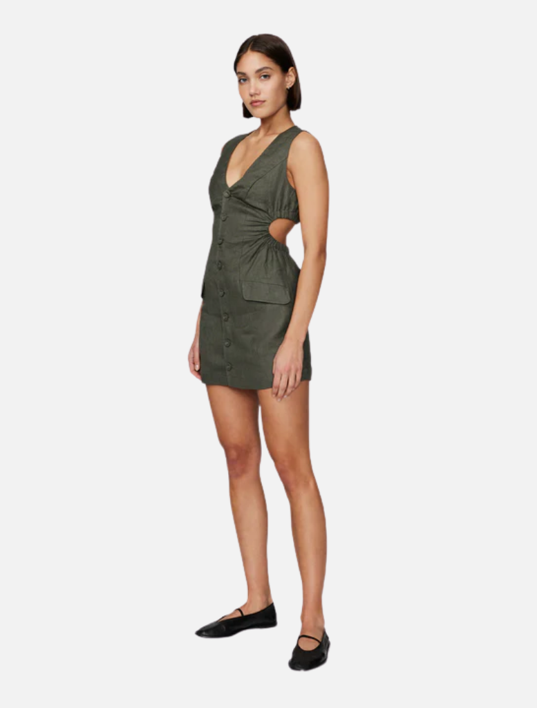 The Charlie Mini Dress has a deep V neckline with a button down front closure. The dress has a gathered waist with elastic cut out details for a flattering shape. Dress up or down this mini can take you anywhere.