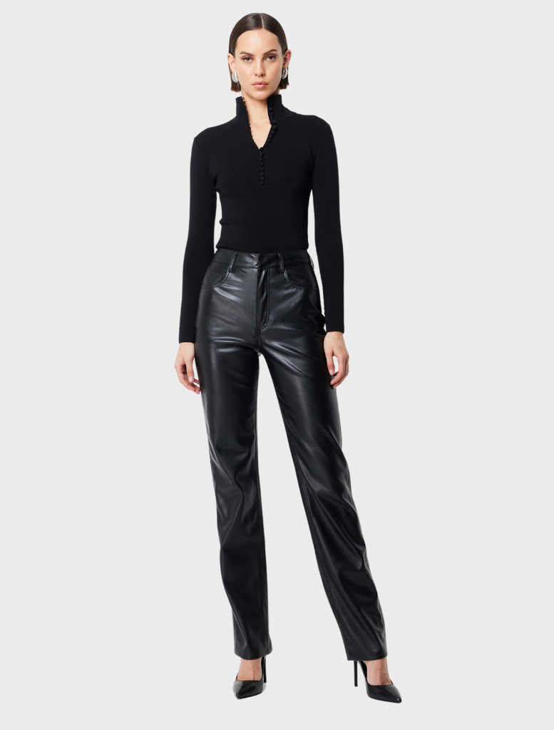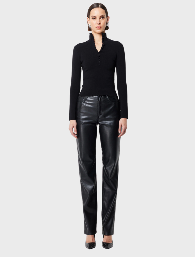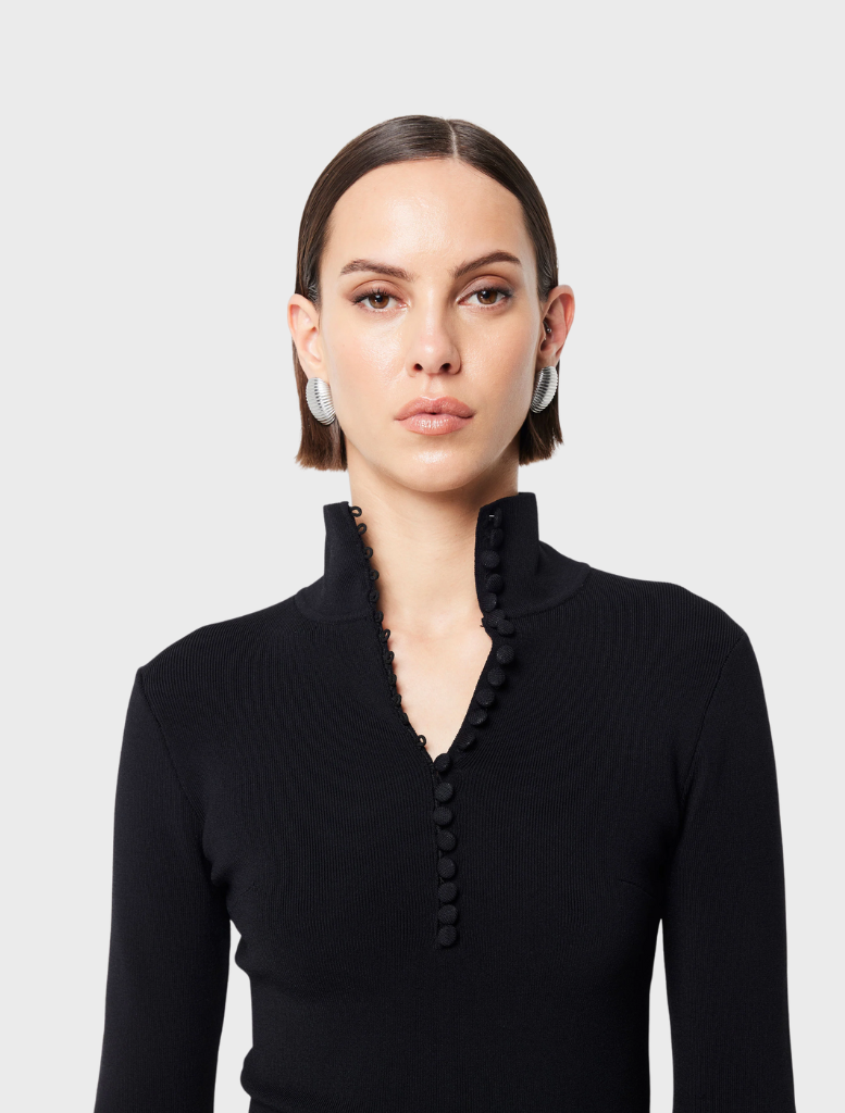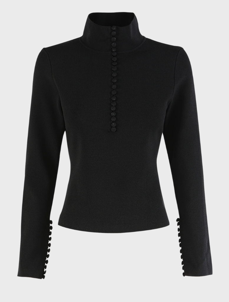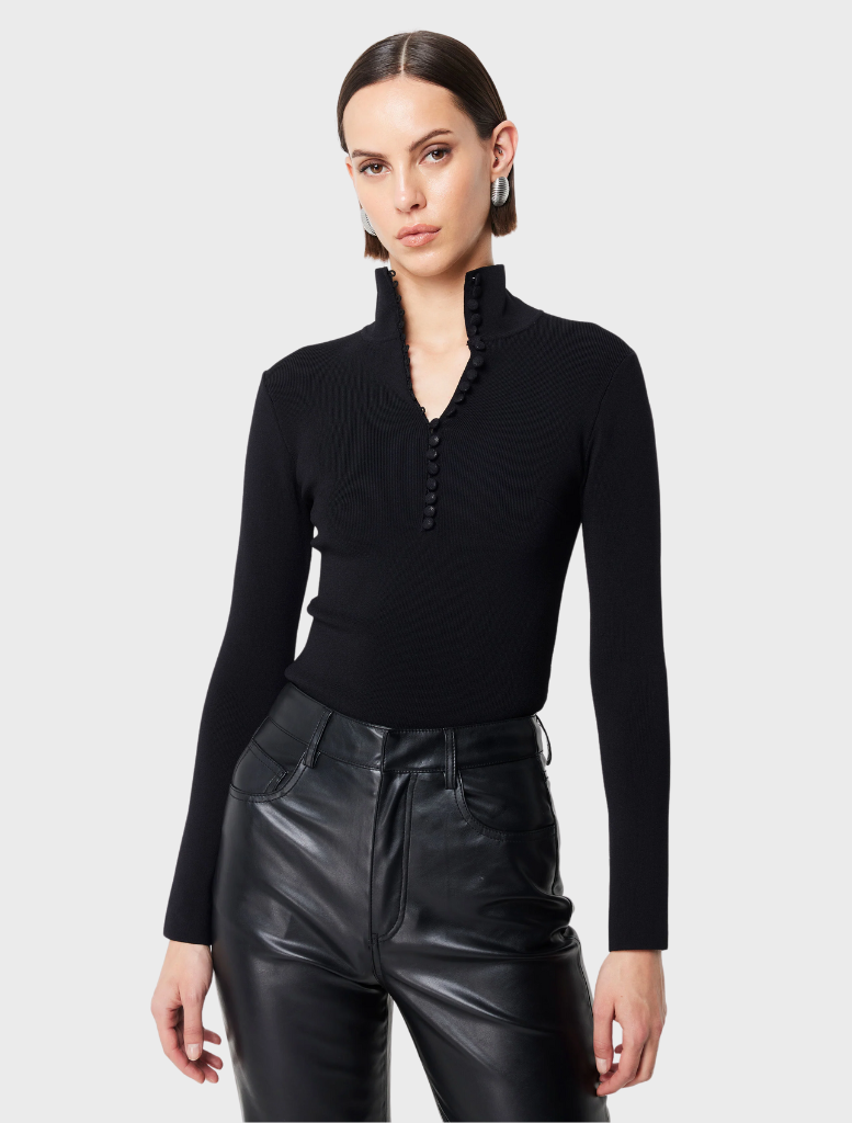 A perfect blend of comfort and style. The Mayfair Long Sleeve Top in Black features a unique detail with buttons running along the V-neckline, adding a touch of sophistication. The same button detail is mirrored on the sleeve cuffs, creating a cohesive and chic look.