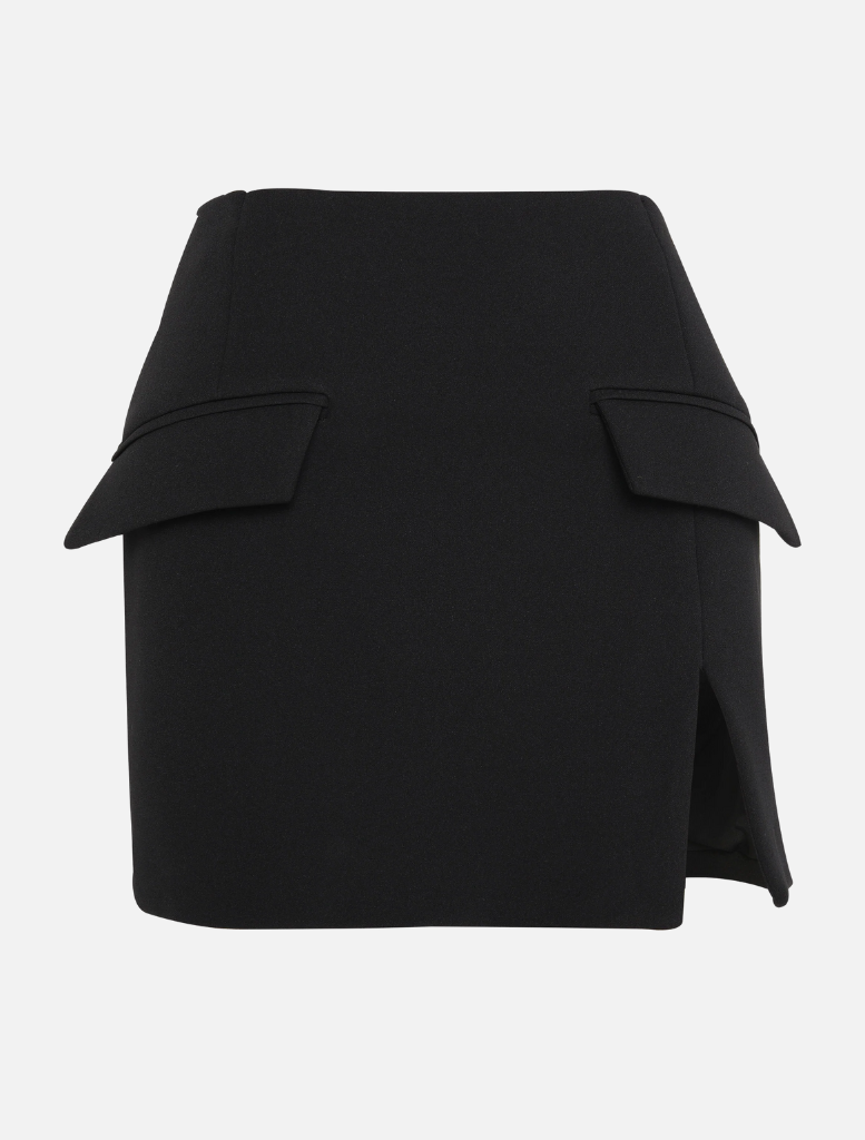 Chic and structured, the Melrose Mini Skirt in black features a sculpted silhouette with a front split, faux flap pocket detailing, and a contrasting back zip closure. Pair it with a crisp shirt for a polished office look or style it with a fitted top and tights for cooler days.