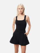 The No Hesitation Short - Black features functional side pockets for everyday convenience and buttoned back pockets for added sophistication. The satin side trim detailing elevates the design, giving it a refined and polished finish. Versatile and chic, these shorts can be dressed up or down depending on the occasion.