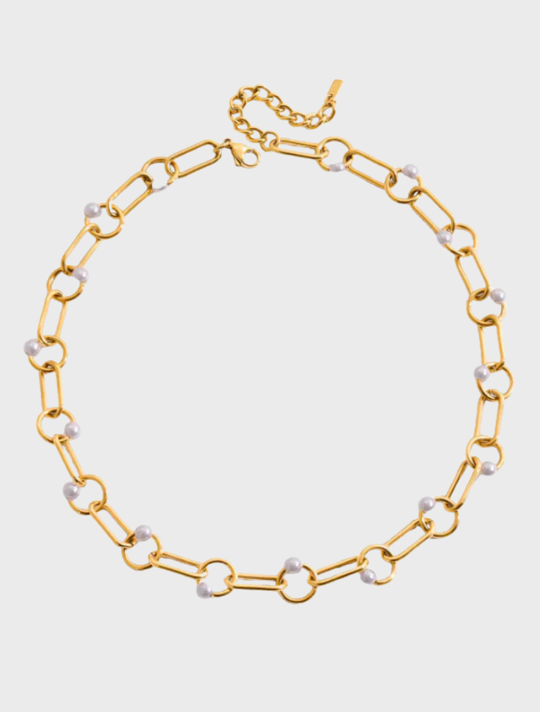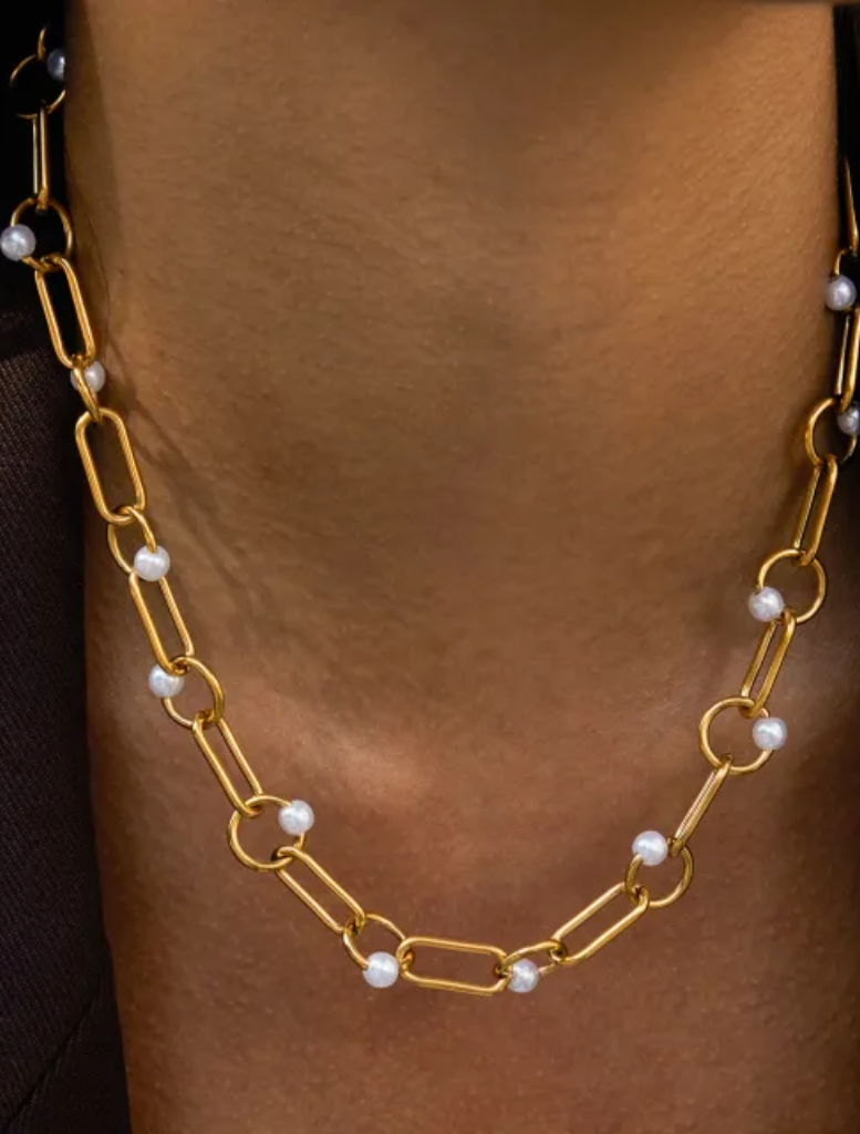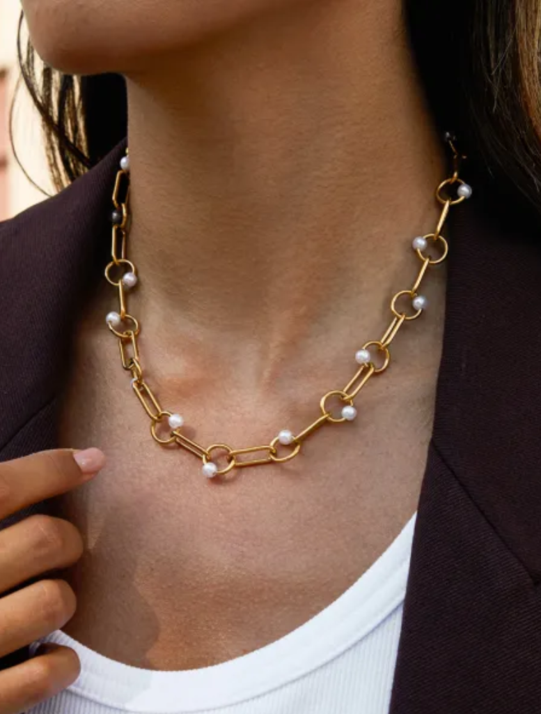 Pair the Esme Pearl Necklace with a simple white tee, linen shirt or soft knit, try combining with a flat snake chain or a delicate satellite chain to create a soft layered stack that feels intentional and effortless. Add small gold huggies for an understated, elegant look.