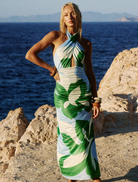 Our Aubrie Cut-Out Maxi Dress features a bold print in fresh green and sky blue tones. With a flattering halter neckline and side split detail, it’s made for sun-drenched days and evenings by the sea.