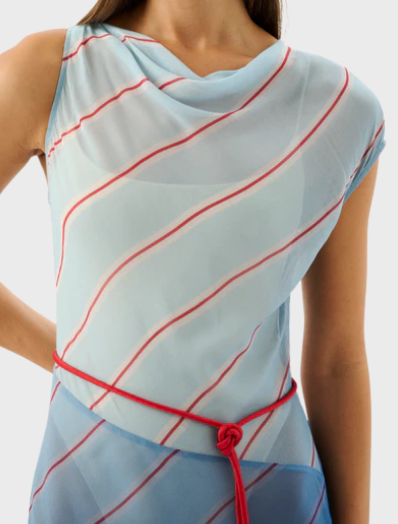 Introducing the Capri Maxi Dress, a true statement piece in the Stripes of the Seas print. Designed with an asymmetric draped neckline, removable contrasting tie detail and a bias-cut silhouette in a sheer fabrication, this elegant style embodies ROAME.’s modern approach to timeless dressing.