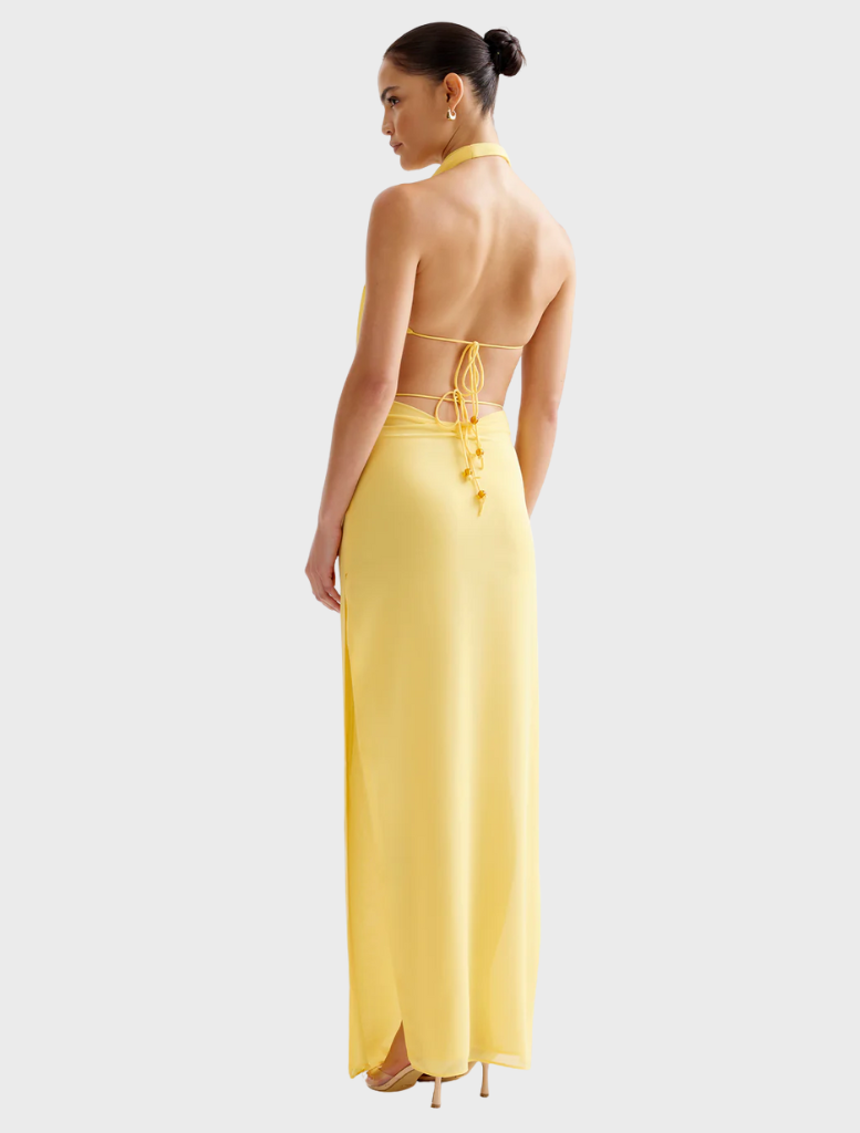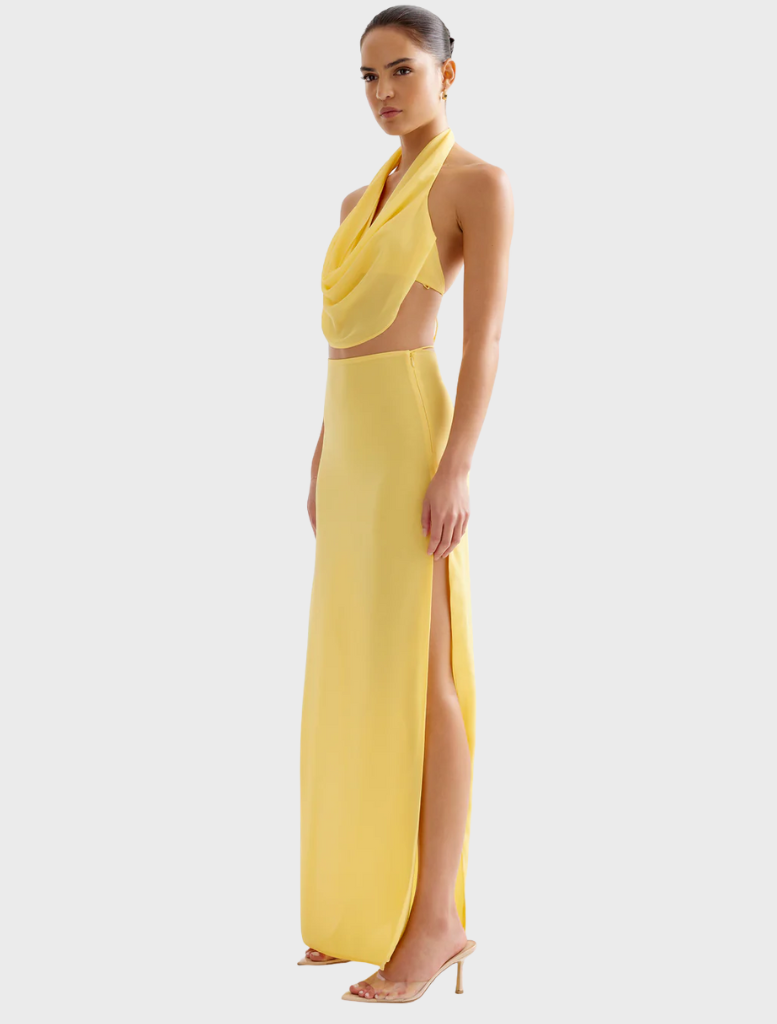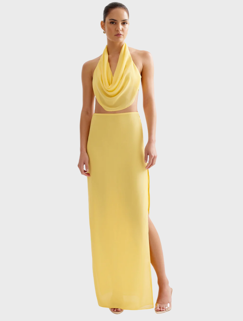 The Clio Set showcases an extravagant, beautifully draped deep cowl neckline, crafted from our lightweight georgette. The sexy exposed back features tie-up horizontal straps finished with a resin bead. The skirt is designed with a sleek straight fit, back cowl, and side splits.