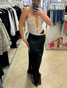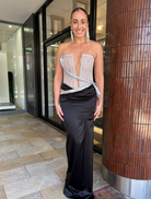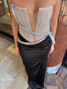Jair dress is a strapless gown featuring a sparkling sequined bodice with a distinctive crisscross pattern that wraps around the waist, creating a cinched effect. The bodice seamlessly transitions into a sleek skirt with a high slit, providing a modern and sophisticated look. The gown's form-fitting silhouette is designed to accentuate the body's contours, flowing into a gentle train at the back.