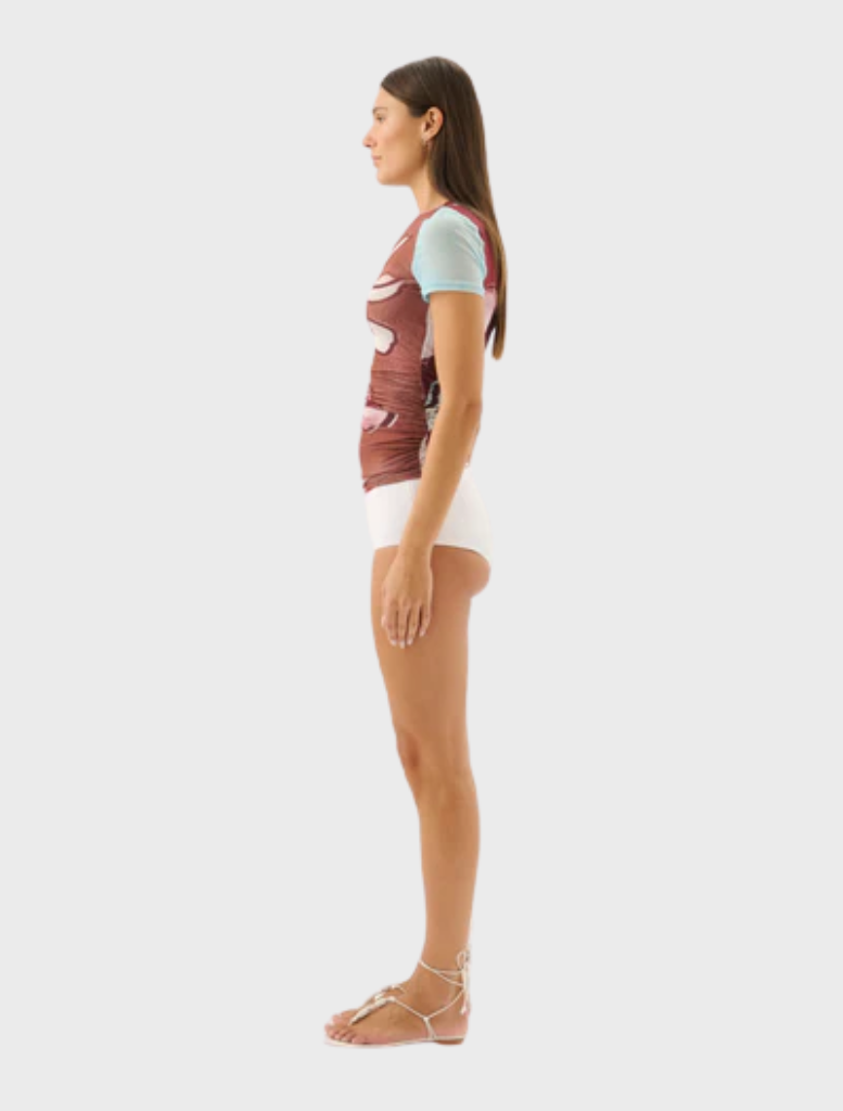 The Marley Tee in Marisol Bloom is crafted in ROAME.’s signature mesh fabrication, offering a fitted silhouette with ruched side detailing for a flattering finish. Featuring a round neckline and short sleeves, this elevated essential is defined by its exclusive print and day-to-night versatility.
