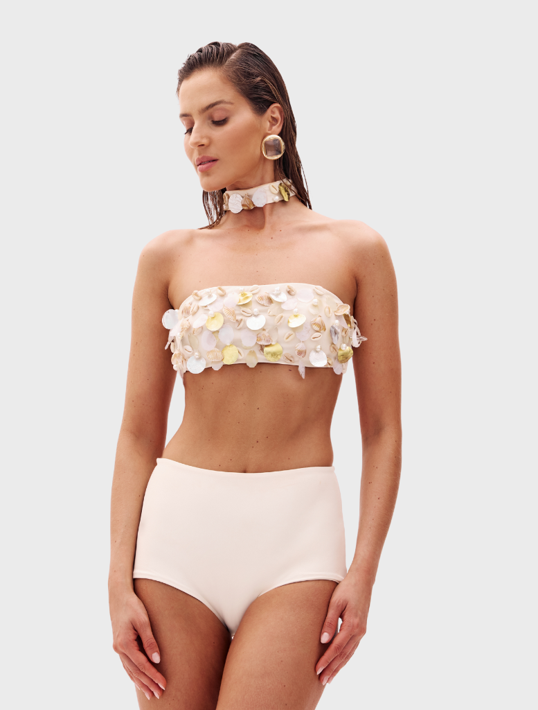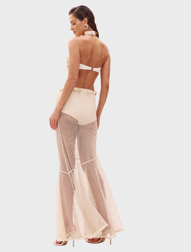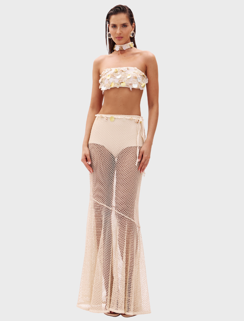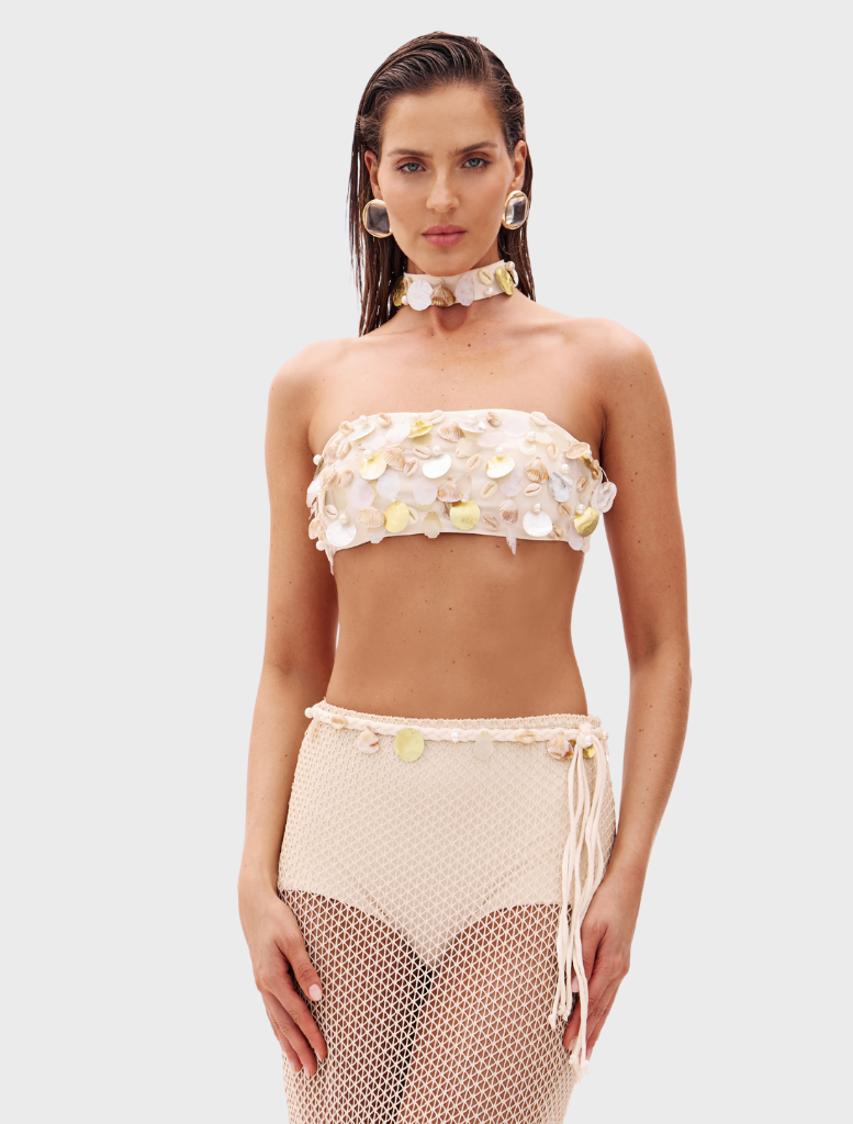 The Leblanc Skirt Set is a true gem from the GREEK PARADISE collection, evoking the ethereal beauty of Greek goddesses and the brilliance of the sun over the Aegean Sea. Every detail, from the shell and mother-of-pearl appliqués to the sophisticated design, has been carefully considered to create a stunning and unique look, perfect for those who wish to embody the sophistication and lightness of the European summer.