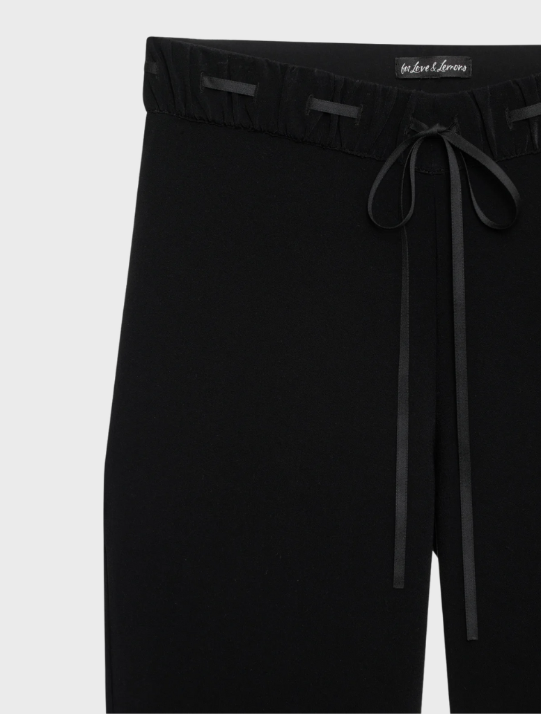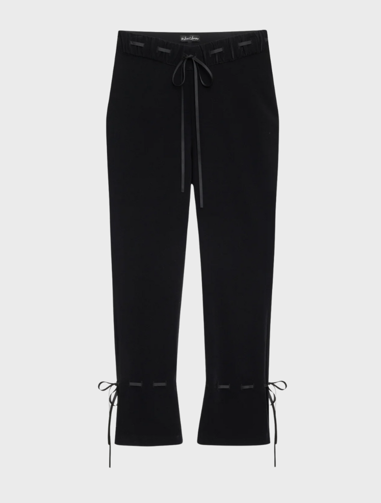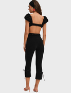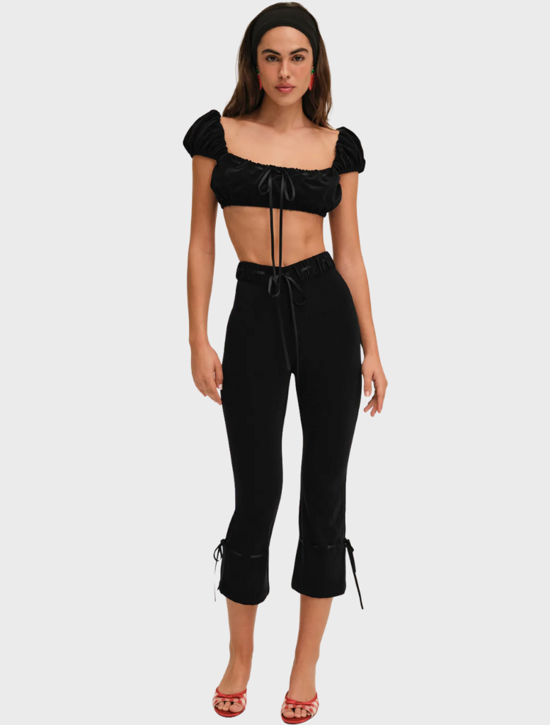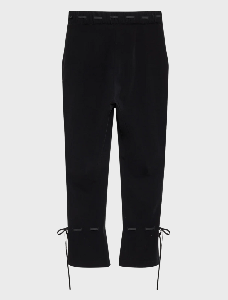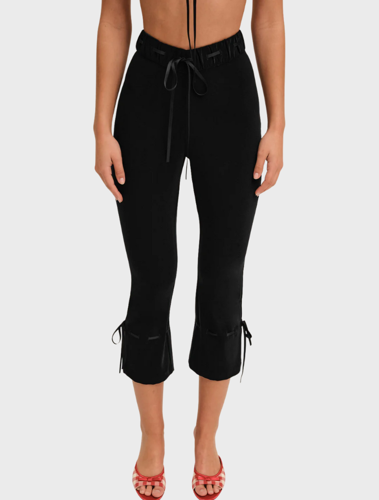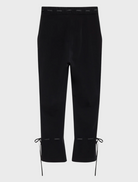 For a polished, minimal-effort look, the Cindy capri pant exudes vintage charm. Crafted in a sleek stretch fabric, these black capri pants feature a gathered elasticated angled waistband and functional ribbon ties at the waist and leg openings for a feminine finish.