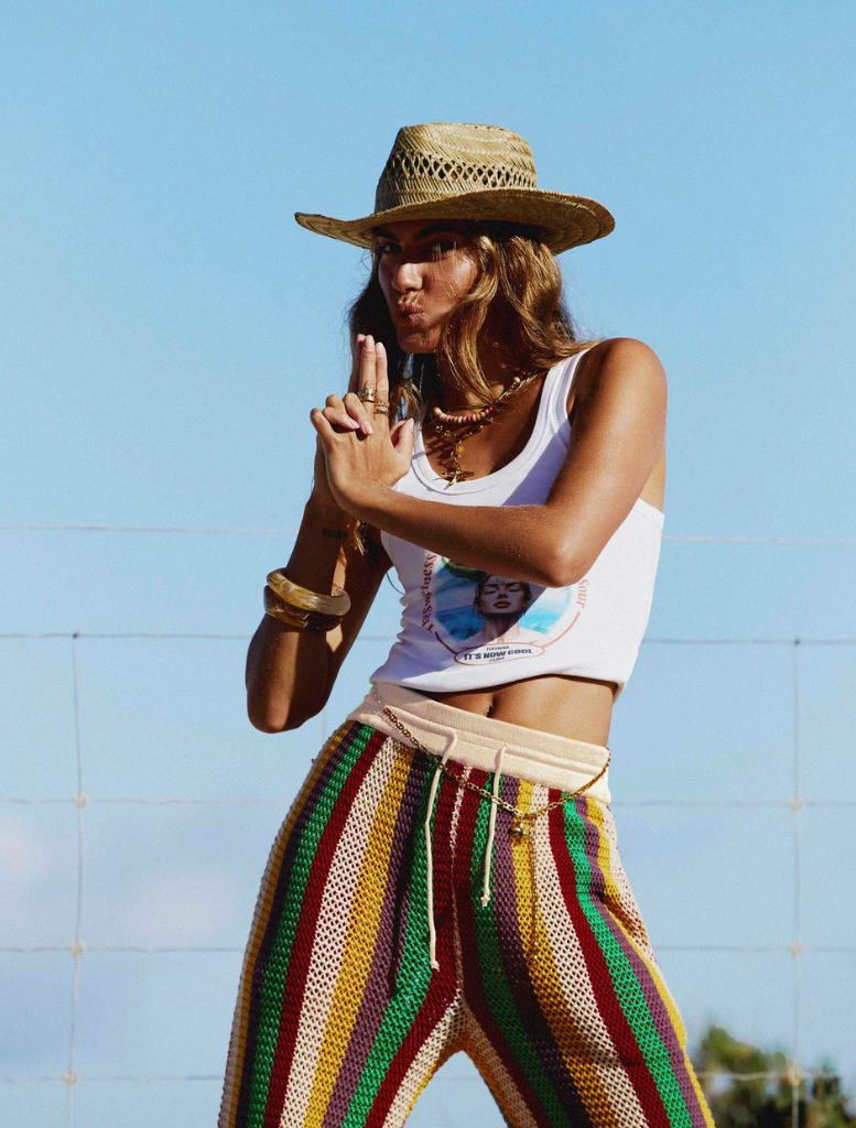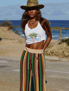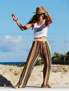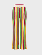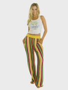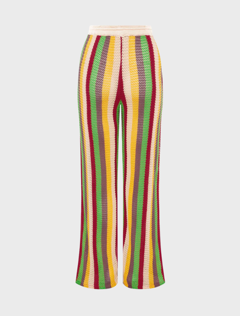 The Crochet Leisure Pant In Tulum Combines Comfort And Style, Showcasing A Loud Multicoloured Crochet Stripe Design.