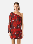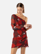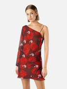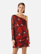 Adorned in our exclusive Briar Rose print: slip into our Dance Shift Dress in Briar Rose. This romantic mini dress features an asymmetric one-shoulder design and a striking low-V backless cut, designed in our bold floral georgette mesh.