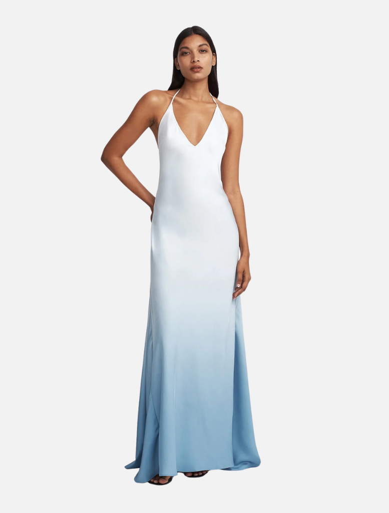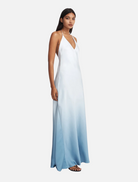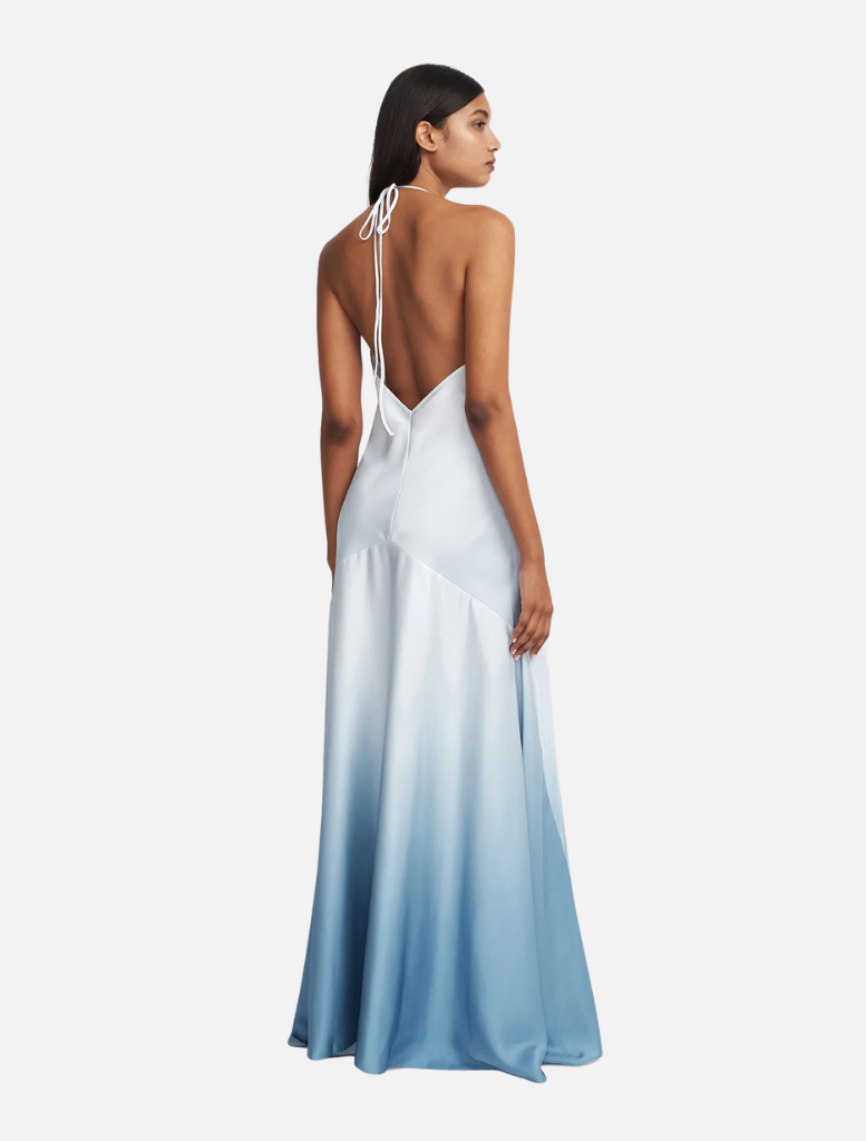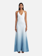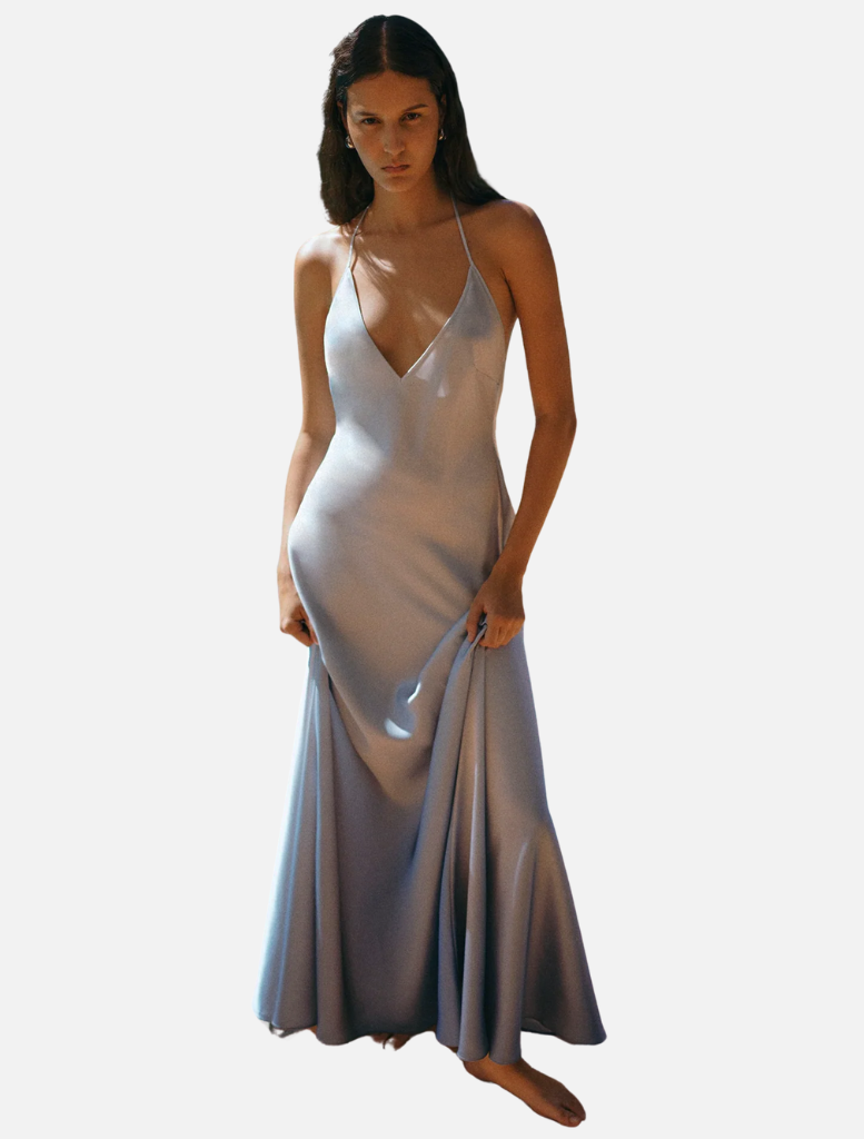 The Kitty Maxi Dress is a bias-cut slip dress with a deep V neckline and a flattering open back with an adjustable back neck tie. Cut from a mid-weight satin fabrication, the dress is unlined to keep it light so it floats with you, but not sheer for ease of wear.