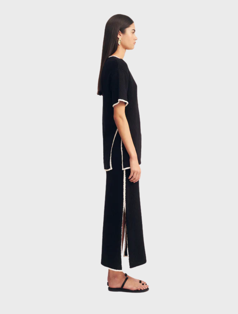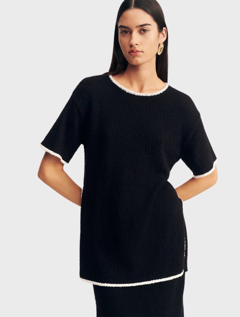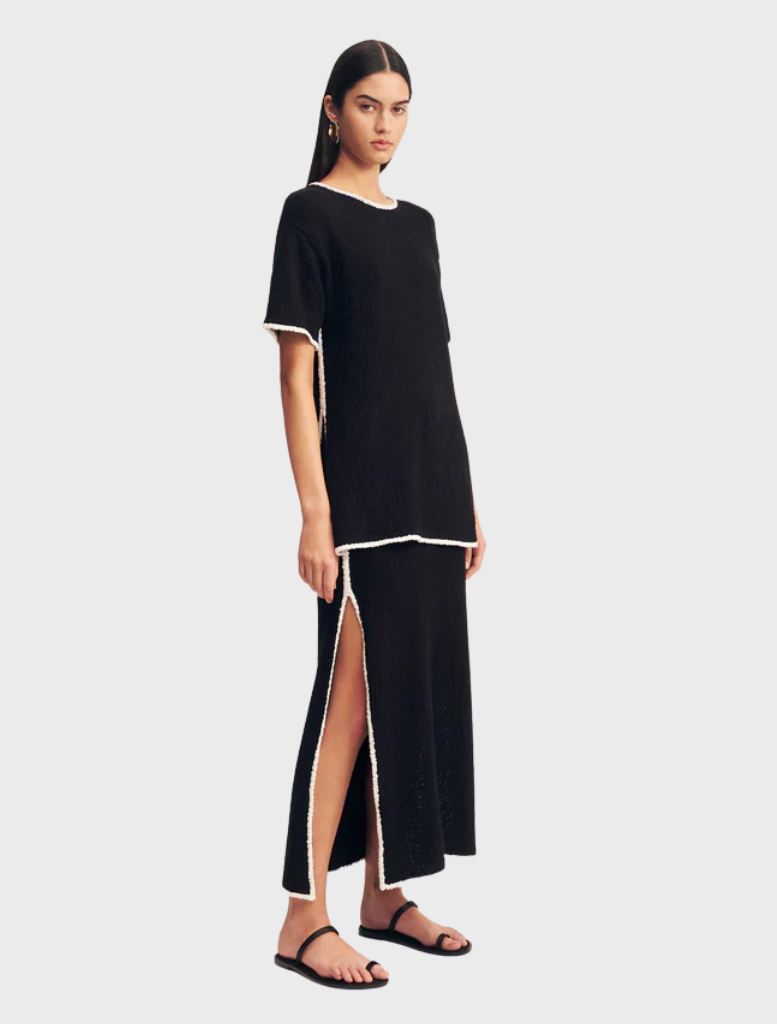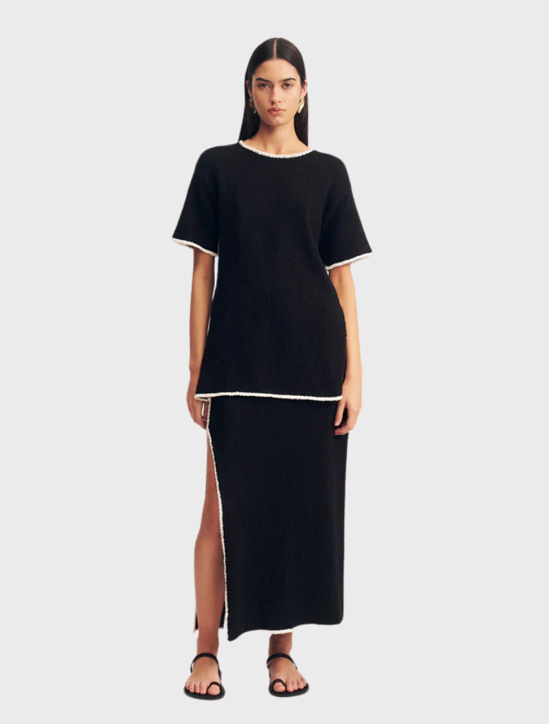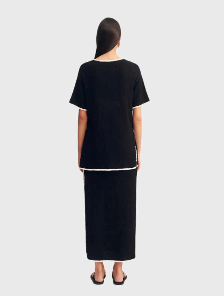 The Lena Tee in Black. Crafted with care from high-quality, textured cotton knit. Discover how effortless comfort and style can be with the relaxed fit of this tee.