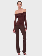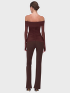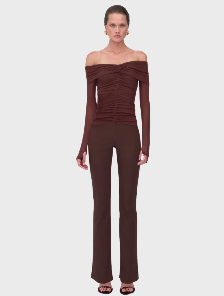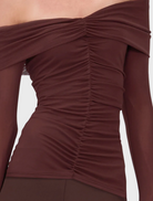The Christy Off-Shoulder Long Sleeve Top is the kind of piece you wear when you want to show just the right amount of skin. Cut from stretch mesh with soft ruching through the body, it flatters and elevates. In deep chocolate, it reads warm, sculptural, and undeniably self-assured.