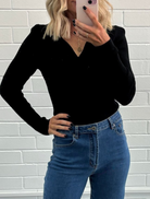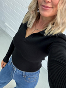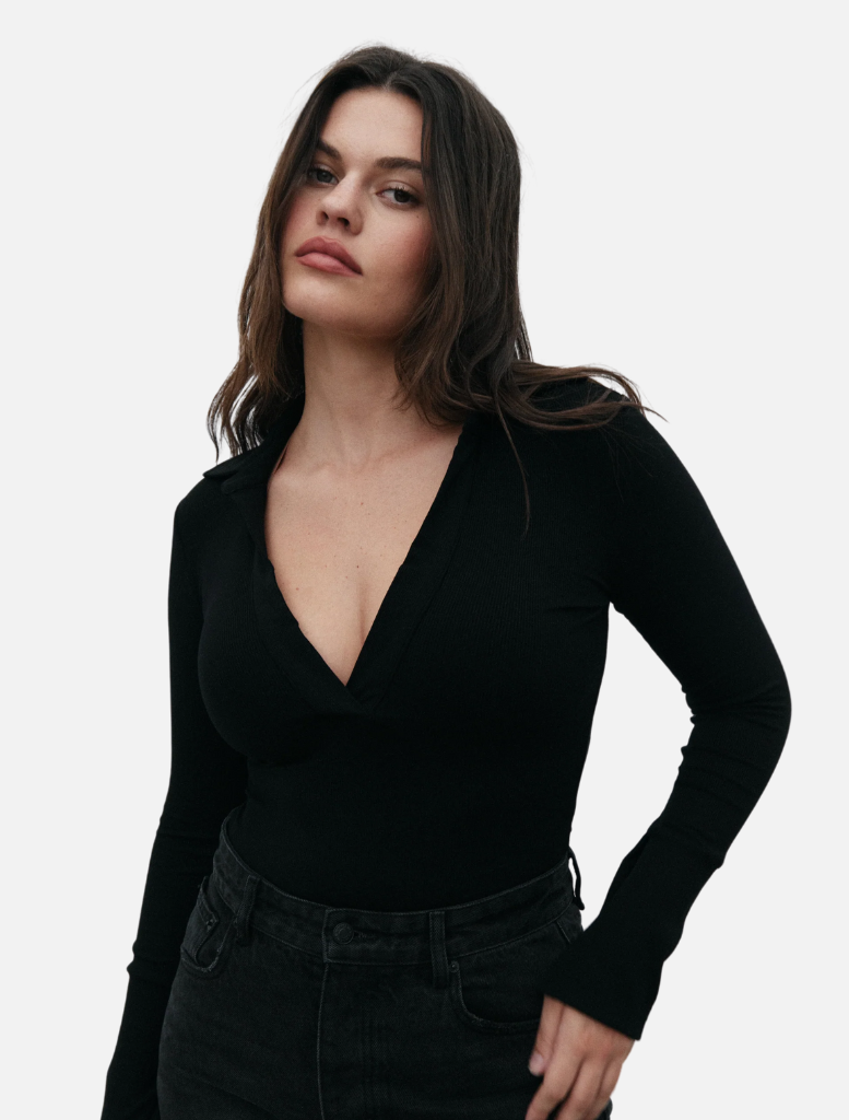 Introducing the Eva Bodysuit a versatile piece crafted from a ribbed fabrication, that allows for a close fit. Featuring a collared design with a deep V neckline and long sleeves, she's the perfect combination of style and comfort.