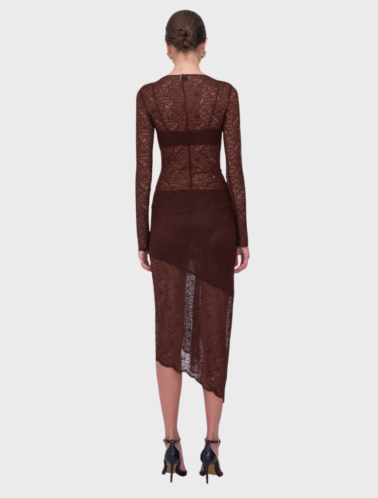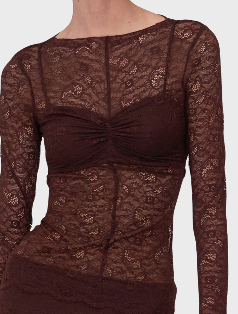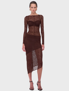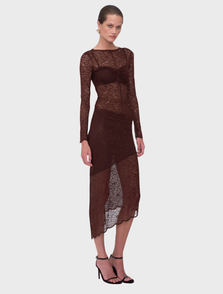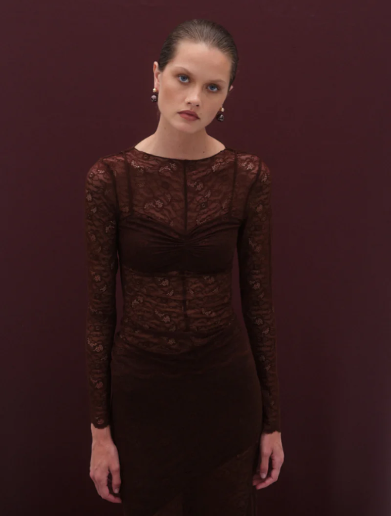 The Paris Long Sleeve Top is crafted from stretch lace and features a high neckline and bralette. Raw scalloped finishes soften its edges, while the slimline cut pairs seamlessly with the matching skirt or structured tailoring.