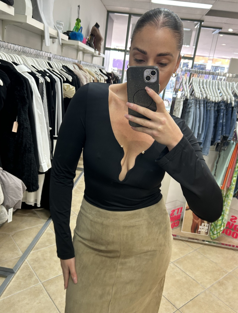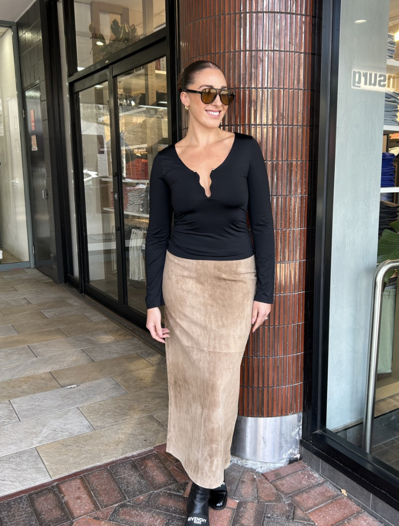 Elevate your essentials with the Tenile Top. This sleek gold bar and ball detail long sleeve features a fitted silhouette that contours to your body for a flattering look. Made from soft jersey fabric, it offers comfort and stretch.