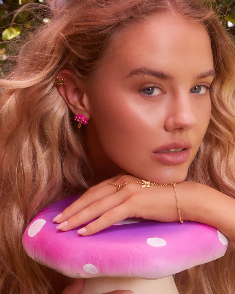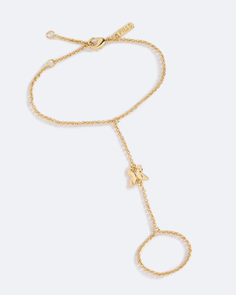 This elegant butterfly wrist chain features an adjustable design for a perfect fit. Crafted from recycled 14k gold or recycled silver plating, it combines sustainability with style. The measurements include a 3-inch finger chain, a hand length ranging from 2.35 to 2.75 inches, and an adjustable wrist closure spanning from 6 to 7.75 inches.