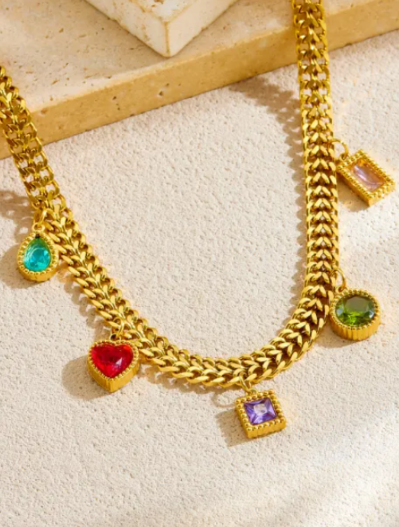 Here to steal the spotlight, Raquel is the statement piece your stack has been waiting for. Adorned with a mix of dazzling colourful stones, this necklace brings the perfect pop of allure to any look.