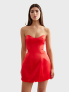 The Gracie Dress is the ultimate playful mini, designed to suit any occasion. It showcases a soft sweetheart neckline and a boned bodice, creating a structured silhouette. The skirt gently flares away from the body, finished with a delicate trim of tulle at the hem for an elegant, feminine touch.
