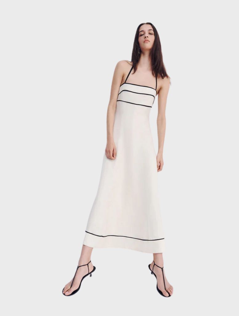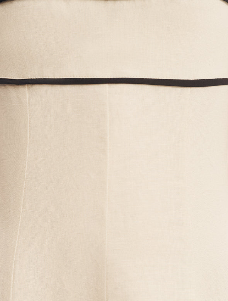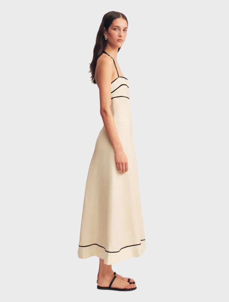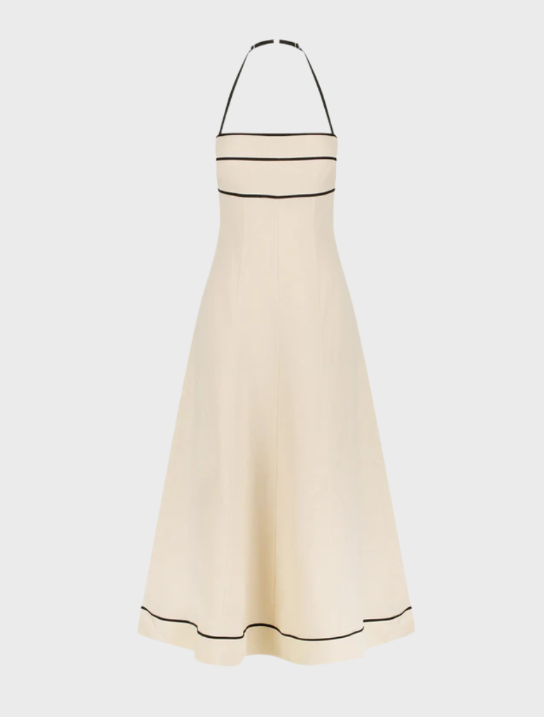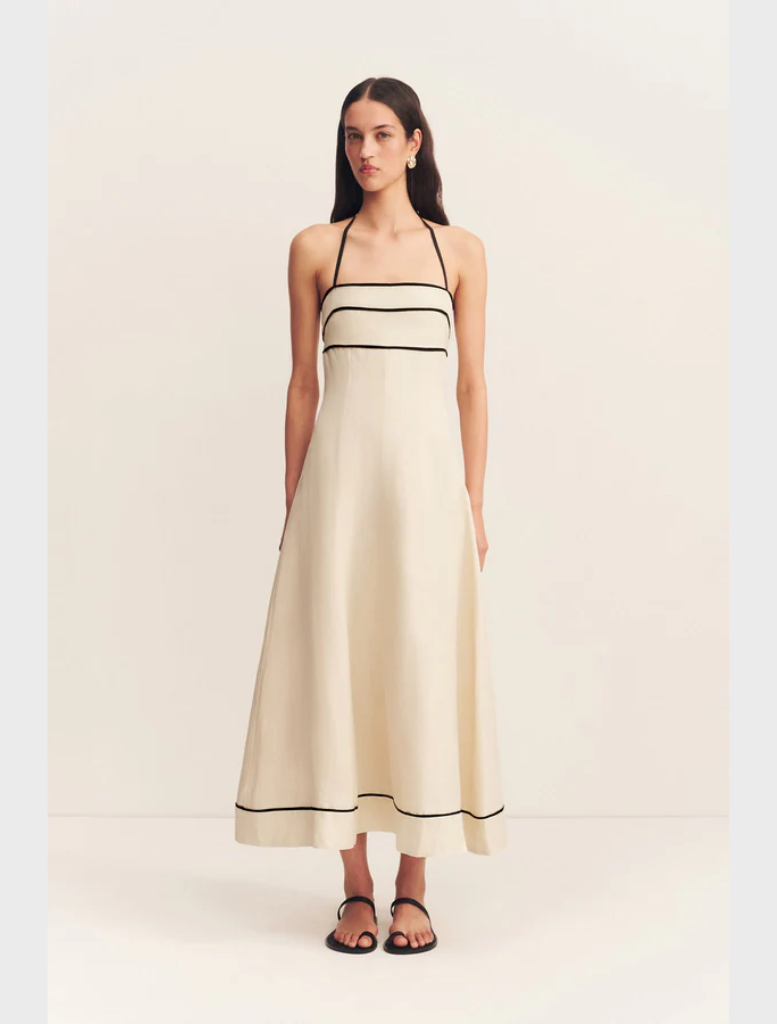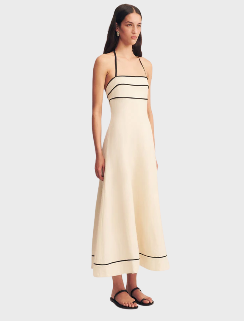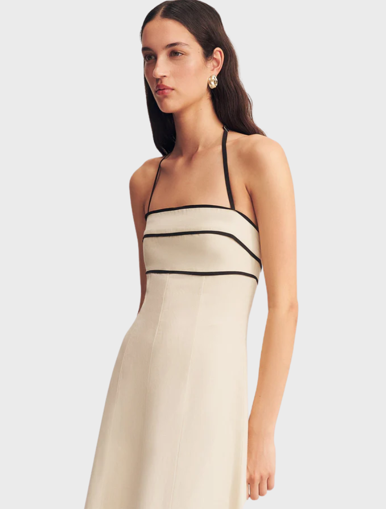 Square neck halter dress in ecru in a premium linen blend with contrast black bind detailing.