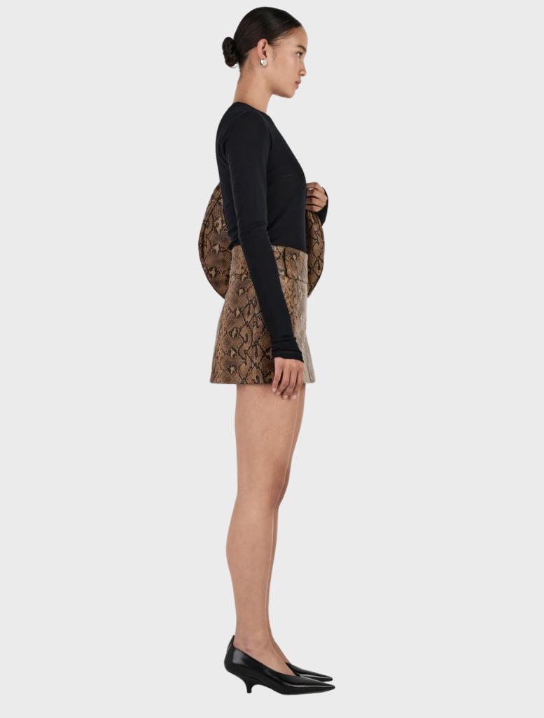 The Dixie Leather Skirt is an A-line leather mini skirt with a wide waistband and a centre back zipper for a sleek silhouette. The Skirt has panel detailing and is fully lined for comfort.