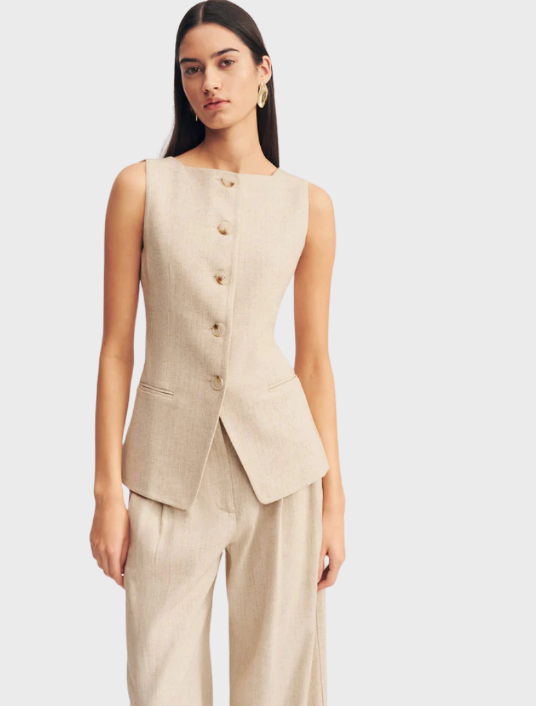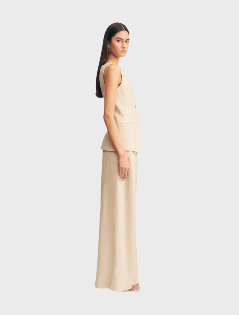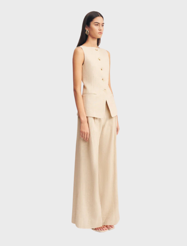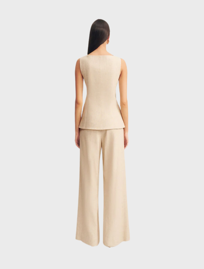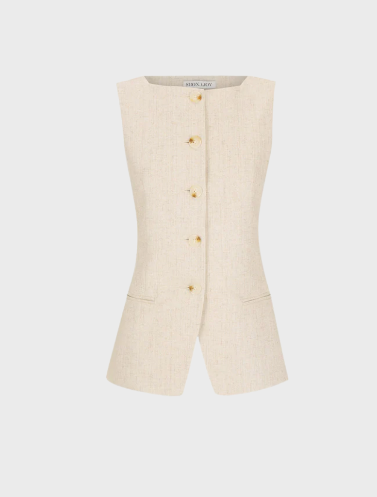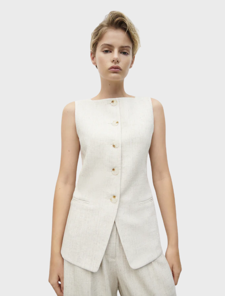 Square neck long line vest in parchment in a textured linen blend suiting.